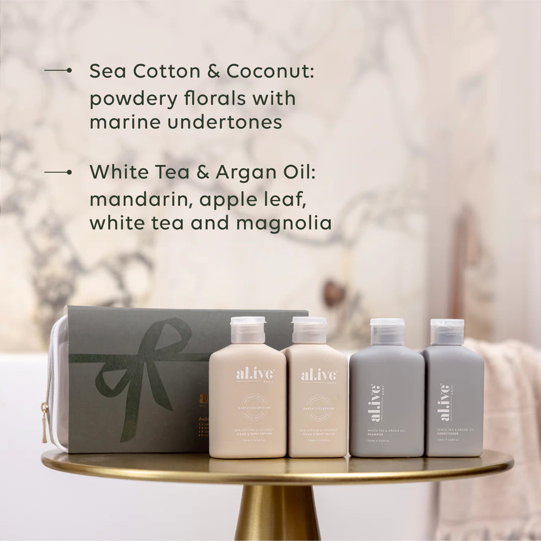 This luxurious set includes Sea Cotton & Coconut Wash and Lotion alongside White Tea & Argan Shampoo and Conditioner - a curated edit of our signature scents designed to nourish from head to toe.