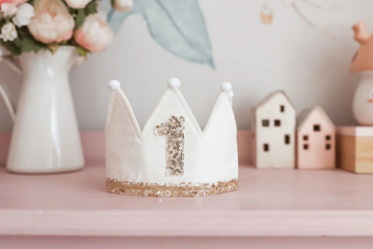 A 1st birthday pink linen and gold adjustable crown for your precious little one to celebrate. Bright sequins and felt with linen backing. Ribbon ties.