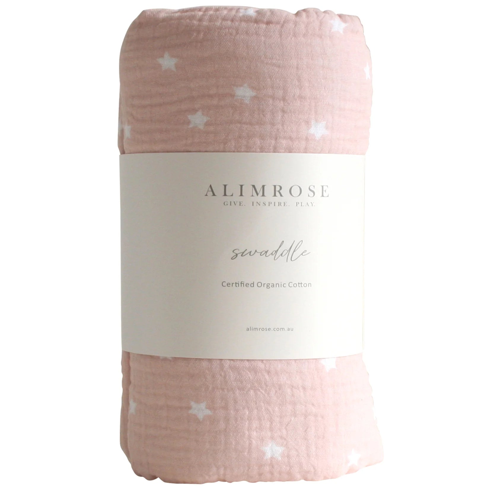 A beautifully soft cotton muslin swaddle generously sized at 120cm x 120cm.