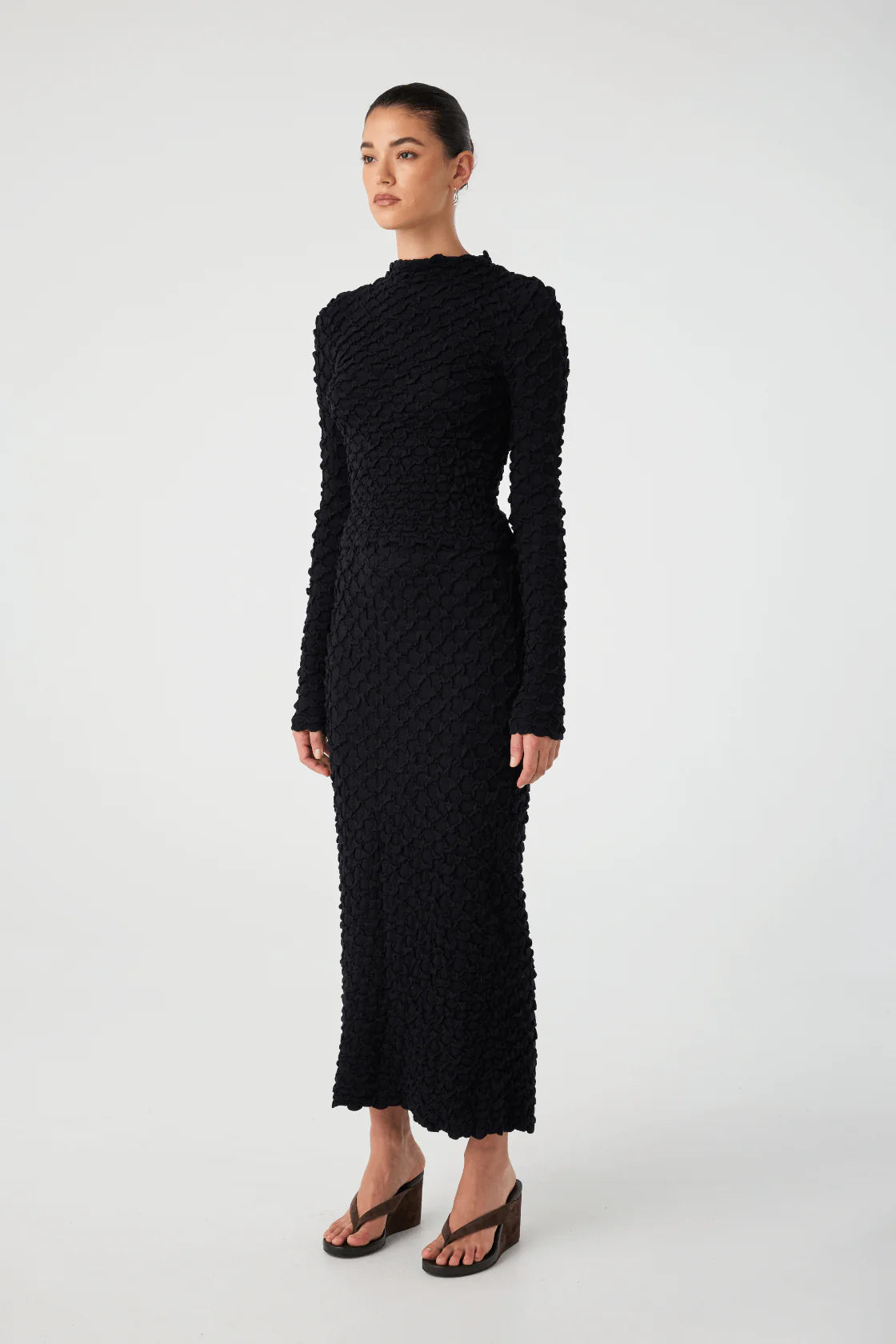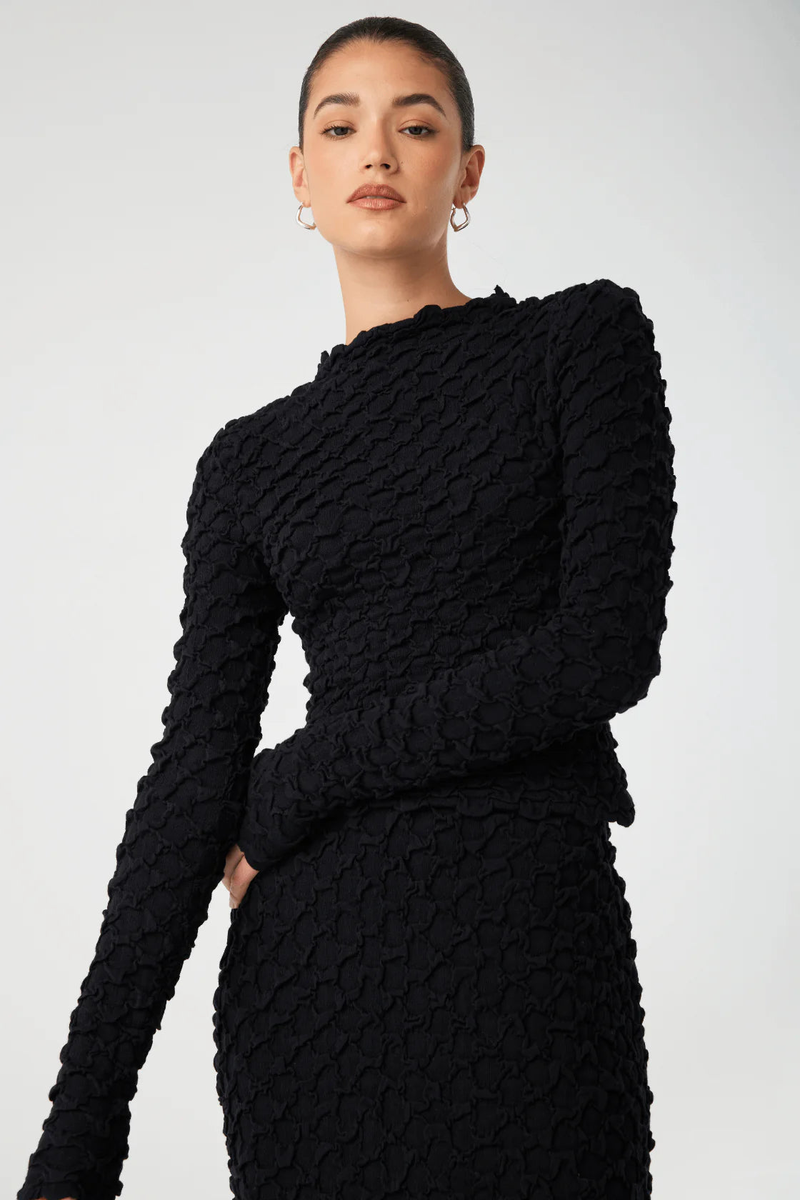 Defined by a sculptural funnel neck and soft bubble knit texture, the Suvi Top in Black brings quiet structure to everyday dressing. The breathable, organic cotton knit moves with ease and feels grounded yet refined.