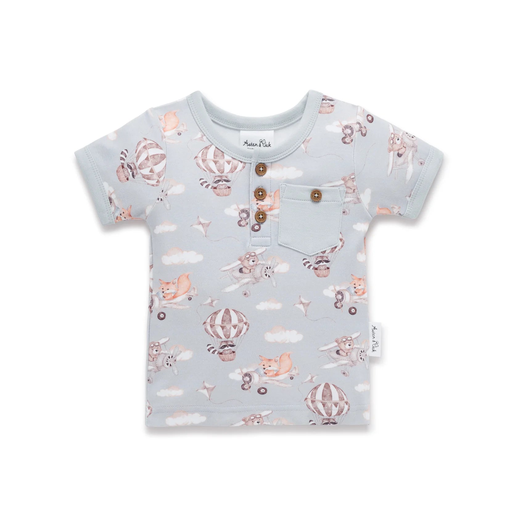 Adventure takes to the skies in our Flying Friends Henley Top – a playful yet practical piece. Set in soft Grey Dawn, crafted from GOTS certified organic cotton and adorned with an adventurous print of vintage aircraft and hot air balloons, this top captures the magic of flight with every wear. Thoughtfully designed with a classic henley neckline, wood-look buttons, and a functional front pocket, it blends everyday comfort with storybook charm.