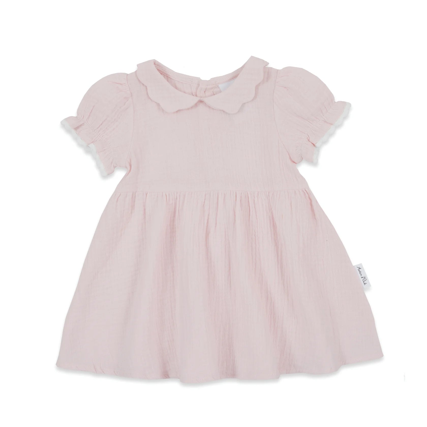 The Pale Pink Muslin Trim Dress is a sweet and timeless design, perfect for creating cherished memories. Crafted from all natural soft, breathable muslin in a delicate blush pink, it features a charming scalloped-edge collar, gathered ruffle puff sleeves, and a gently flared skirt for a classic silhouette. Buttons down the back add style and make for easy dressing, while the lightweight fabric ensures comfort on warm, sunny days. A beautiful choice for special occasions or everyday elegance.