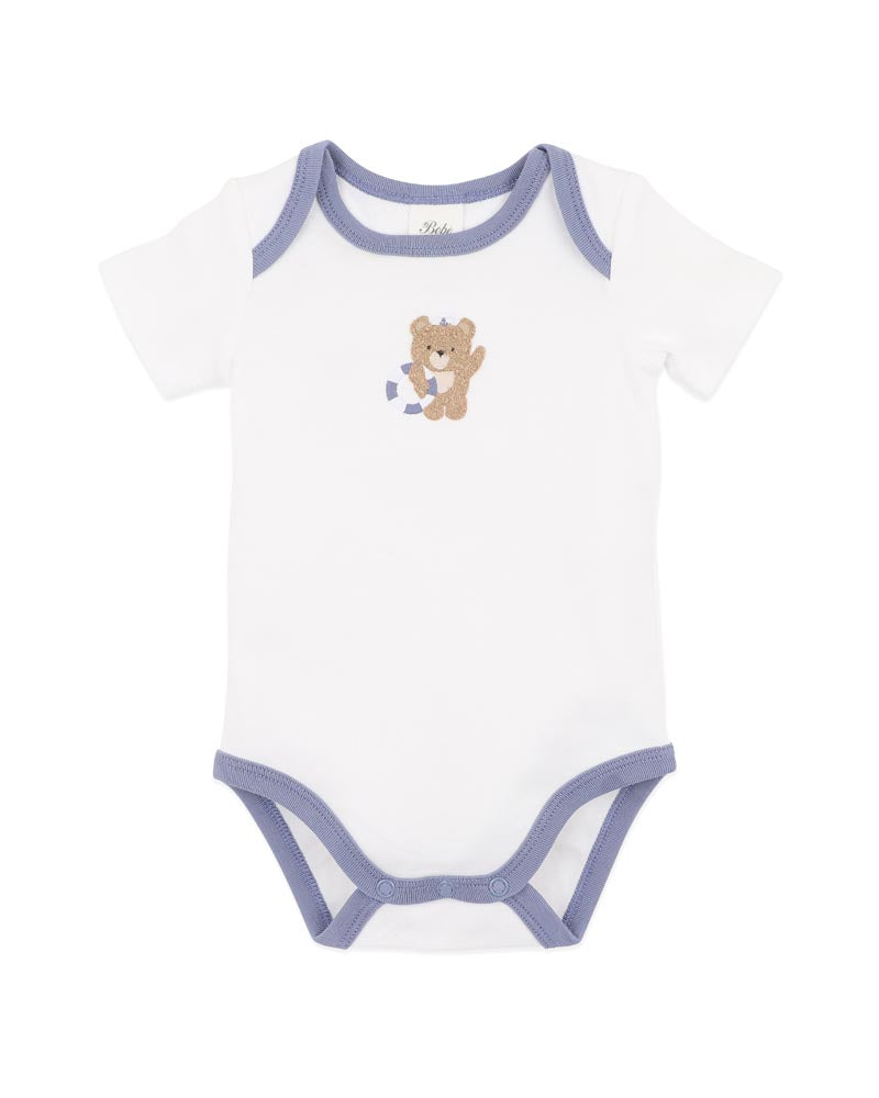 Bring a touch of nautical charm to your baby's wardrobe with this soft and breathable Organic Cotton Bodysuit, featuring a sweet bouclé textural bear embroidery holding a lifebuoy ring. Thoughtfully designed with an envelope neck for easy dressing and a press stud opening at the crotch for quick and fuss-free nappy changes, this piece is as practical as it is adorable. Match it back with the Axel rib shorts or Axel stripe leggings for an effortlessly coordinated look.
