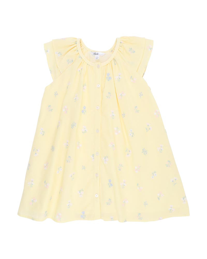 Let the sunshine in with this beautifully embroidered yellow dress, perfect for bright days and playful adventures. Made from a breathable cotton-linen blend and fully lined in soft cotton, it features flutter sleeves, a relaxed silhouette, and delicate all-over floral embroidery. Flat piping at the neckline and a back button opening make this dress both polished and practical for everyday wear or special occasions.