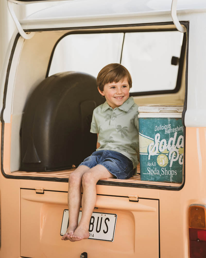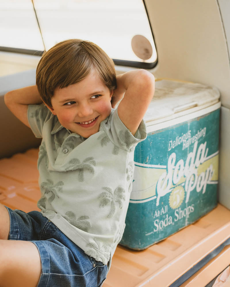 For the little adventurer who dreams of island days and balmy breezes, this palm jacquard polo tee is the perfect everyday staple. Soft and breezy with a textured twist, it's made for beach strolls, backyard games, and everything in between. Match it back with the Boys sage green shorts or Boys knit denim shorts for a cute outfit.
