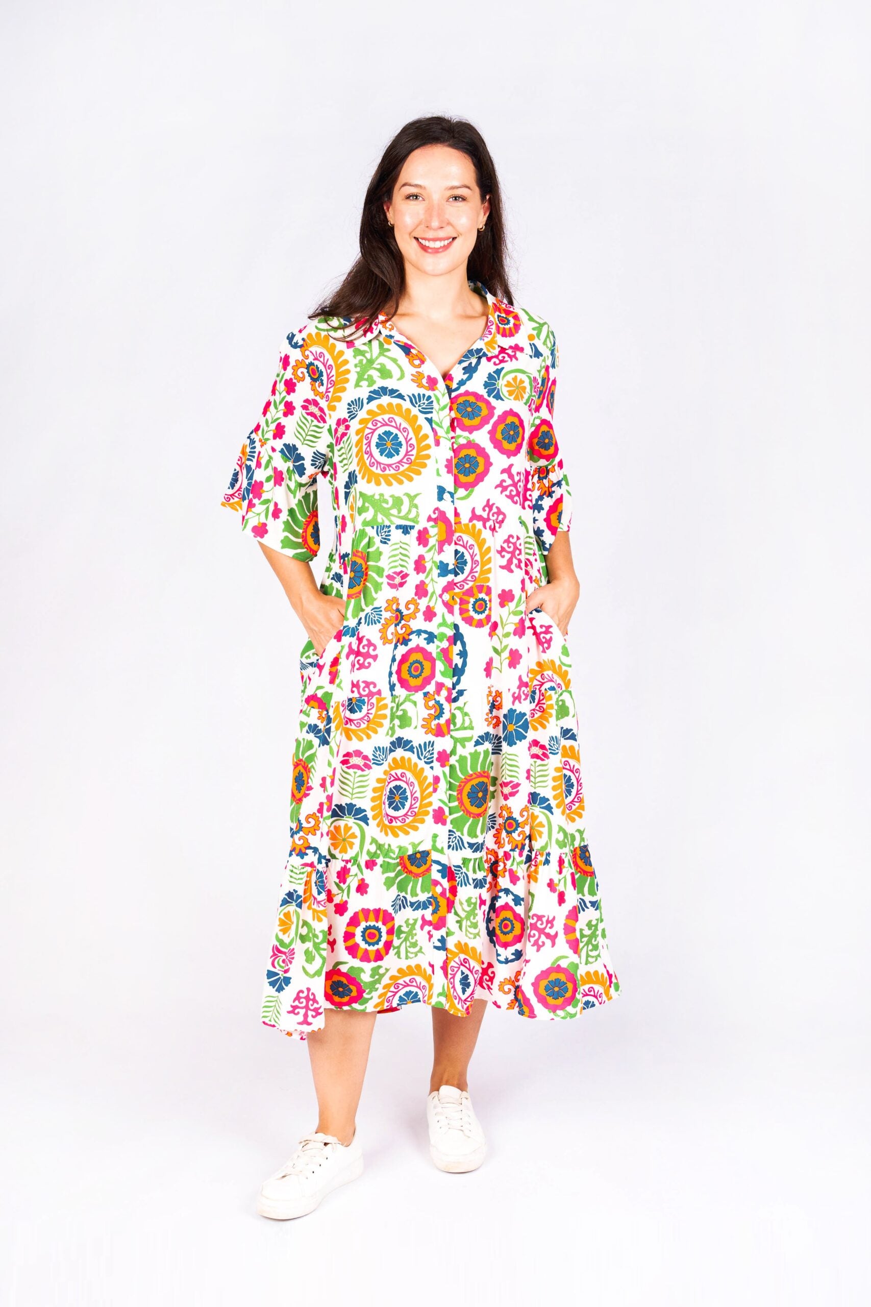 Midi dress with collar neck and bell sleeves, front buttons and inseam pockets.