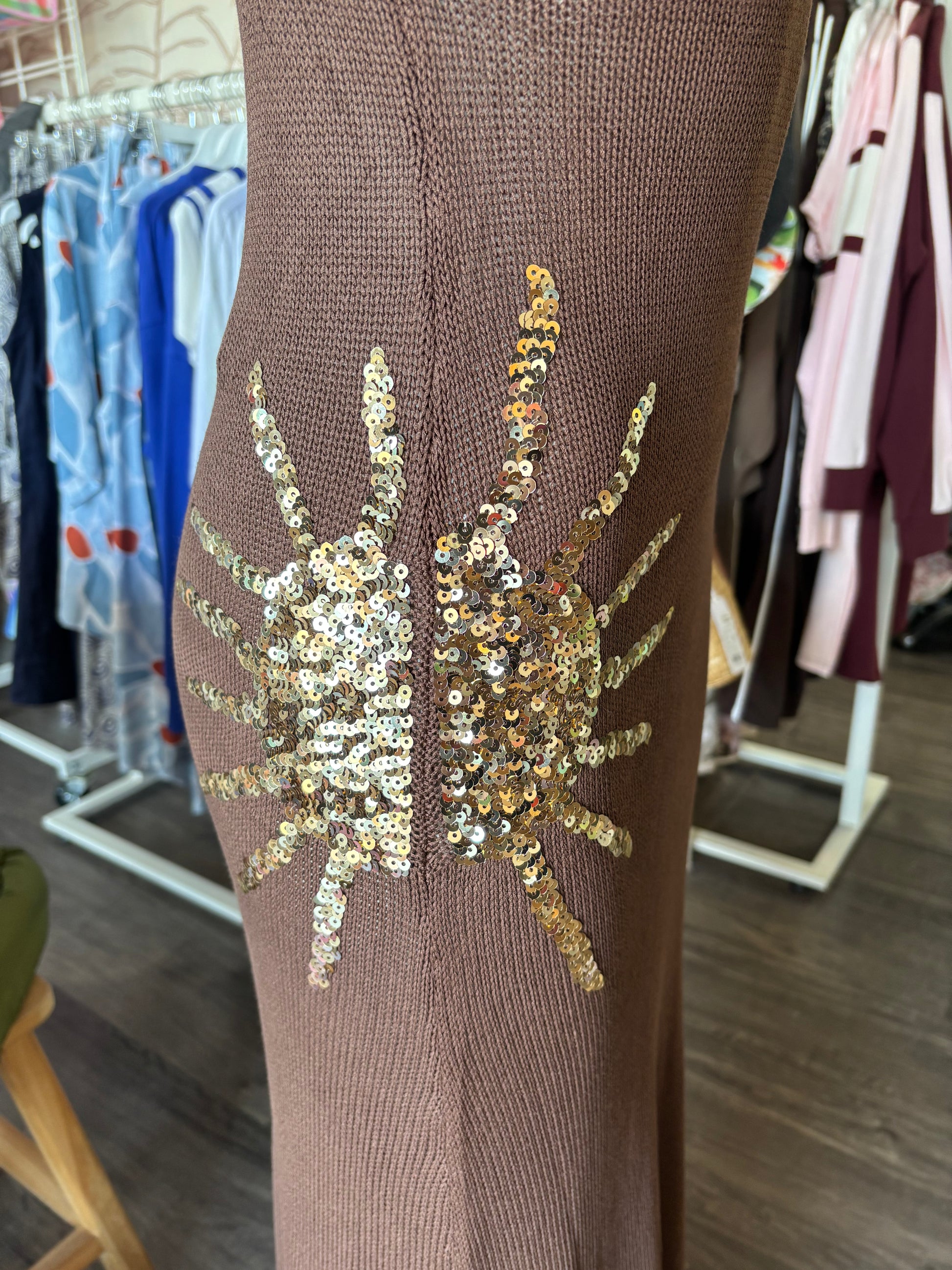 A beautiful V-neck maxi knit dress featuring a sequin sun detail at the hips. Finished with adjustable straps for an easy, flattering fit.
