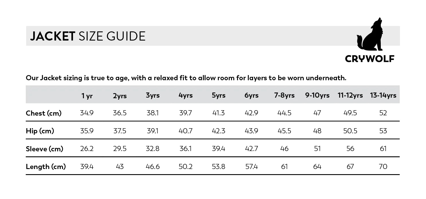 Our Explorer Jacket sizing is true to age, with a relaxed fit to allow room for layers to be worn underneath. Refer to the Crywolf Size Guide for more information.