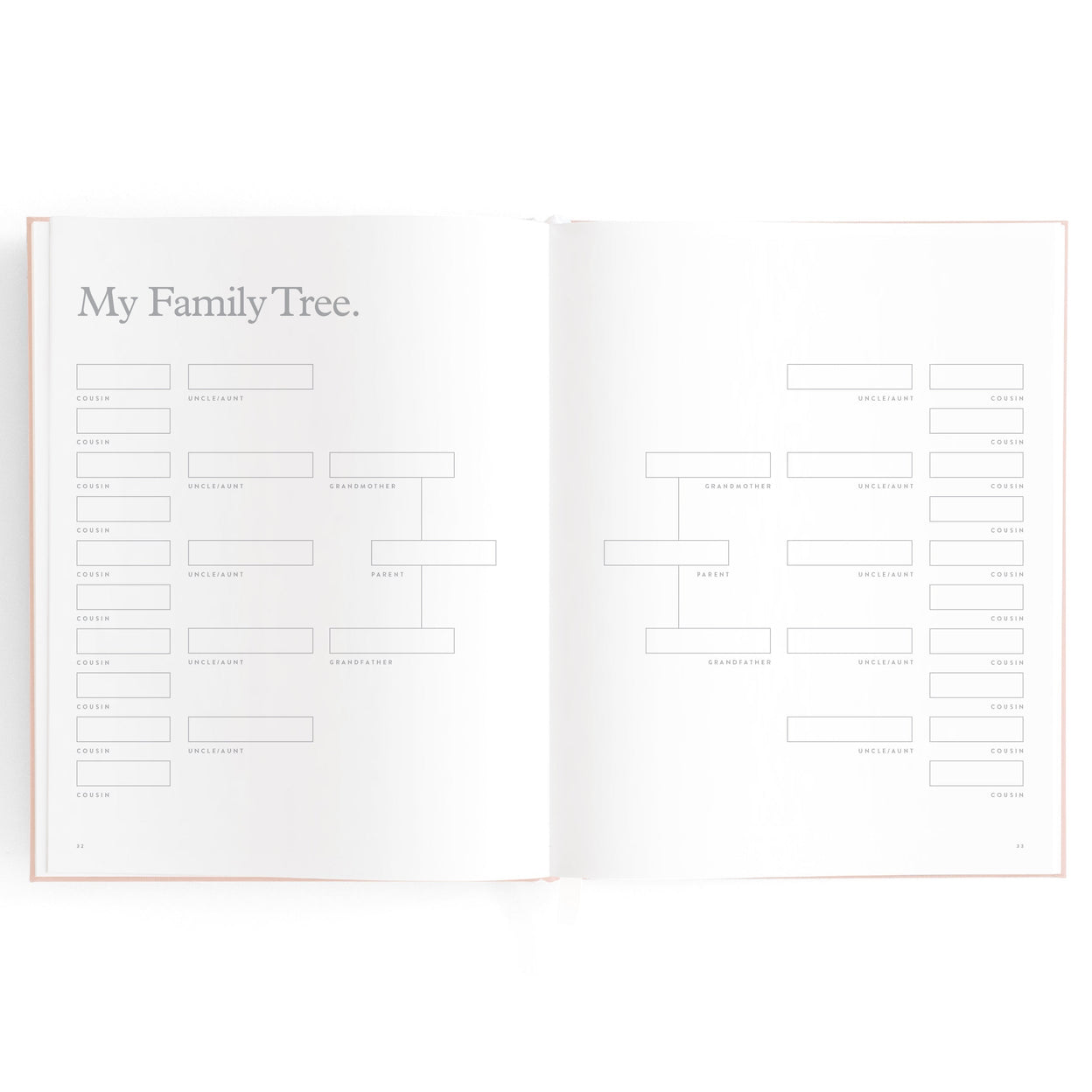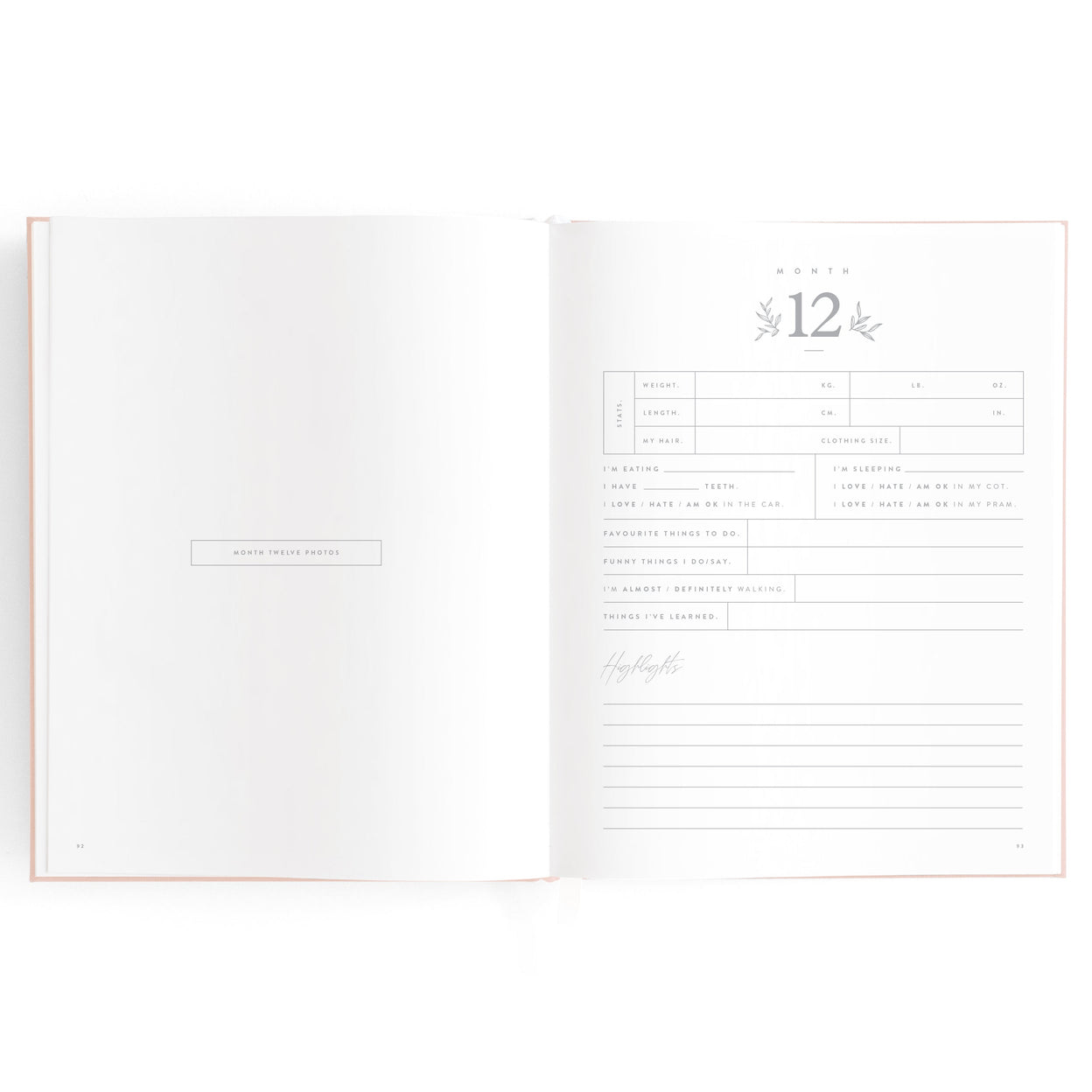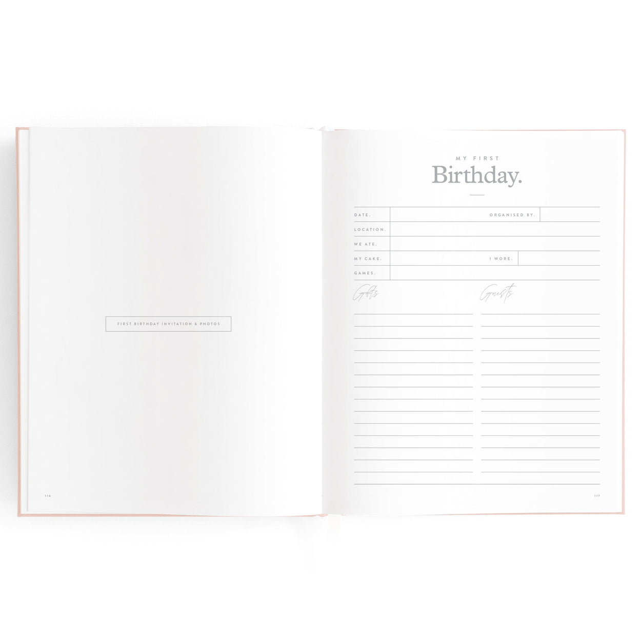 Includes: important milestones and firsts, family profiles, family tree and travel map, playgroup and daycare through to kindy and school years, time capsule, nicknames and celebrations, pets, friends, birthdays and more.