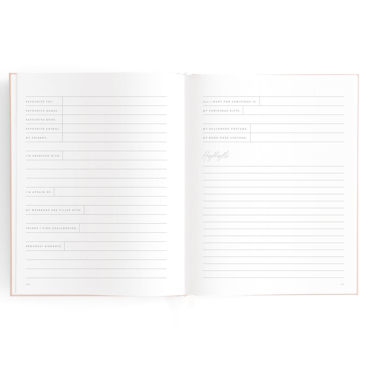 Includes: important milestones and firsts, family profiles, family tree and travel map, playgroup and daycare through to kindy and school years, time capsule, nicknames and celebrations, pets, friends, birthdays and more.