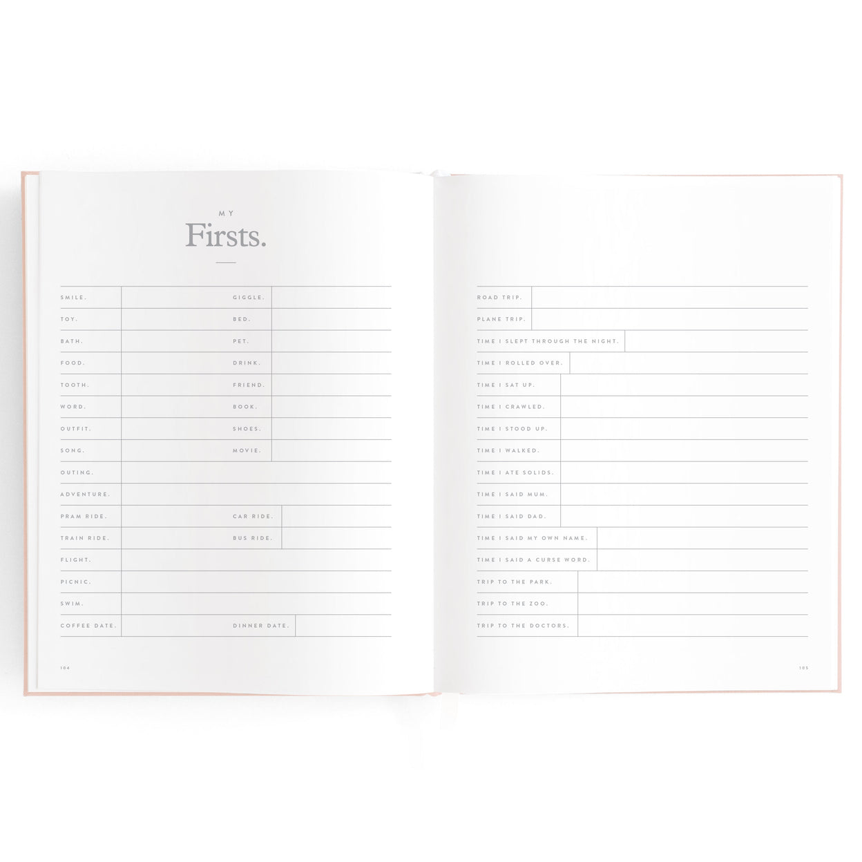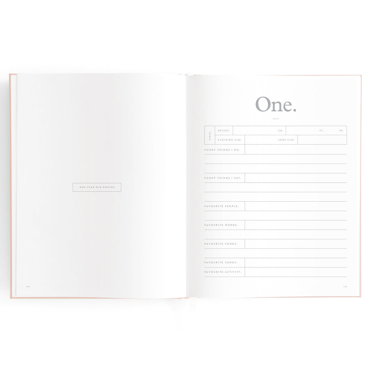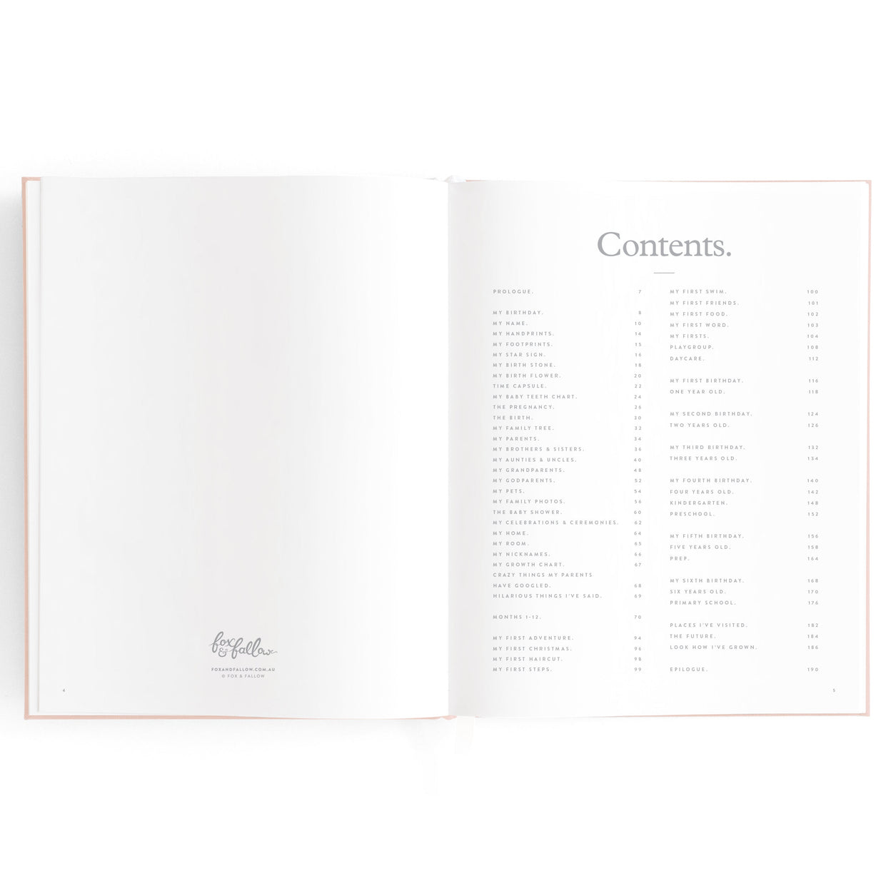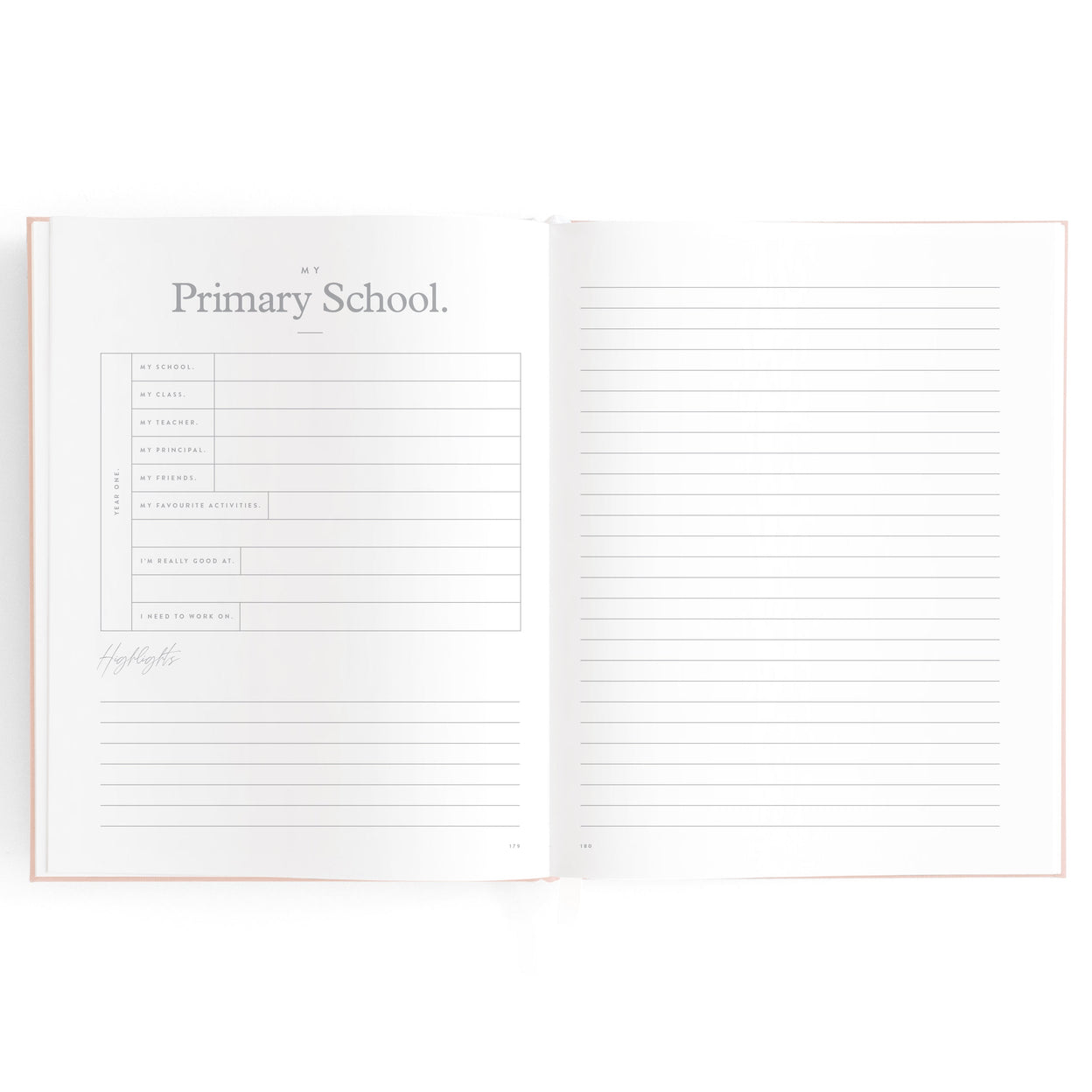 Includes: important milestones and firsts, family profiles, family tree and travel map, playgroup and daycare through to kindy and school years, time capsule, nicknames and celebrations, pets, friends, birthdays and more.