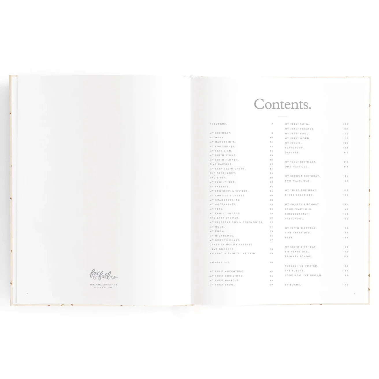 A beautiful keepsake for the whole family to enjoy in a blank cream linen box with small Fox & Fallow logo on the base. Includes: important milestones and firsts, family profiles, family tree and travel map, playgroup and daycare through to kindy and school years, time capsule, nicknames and celebrations, pets, friends, birthdays and more.