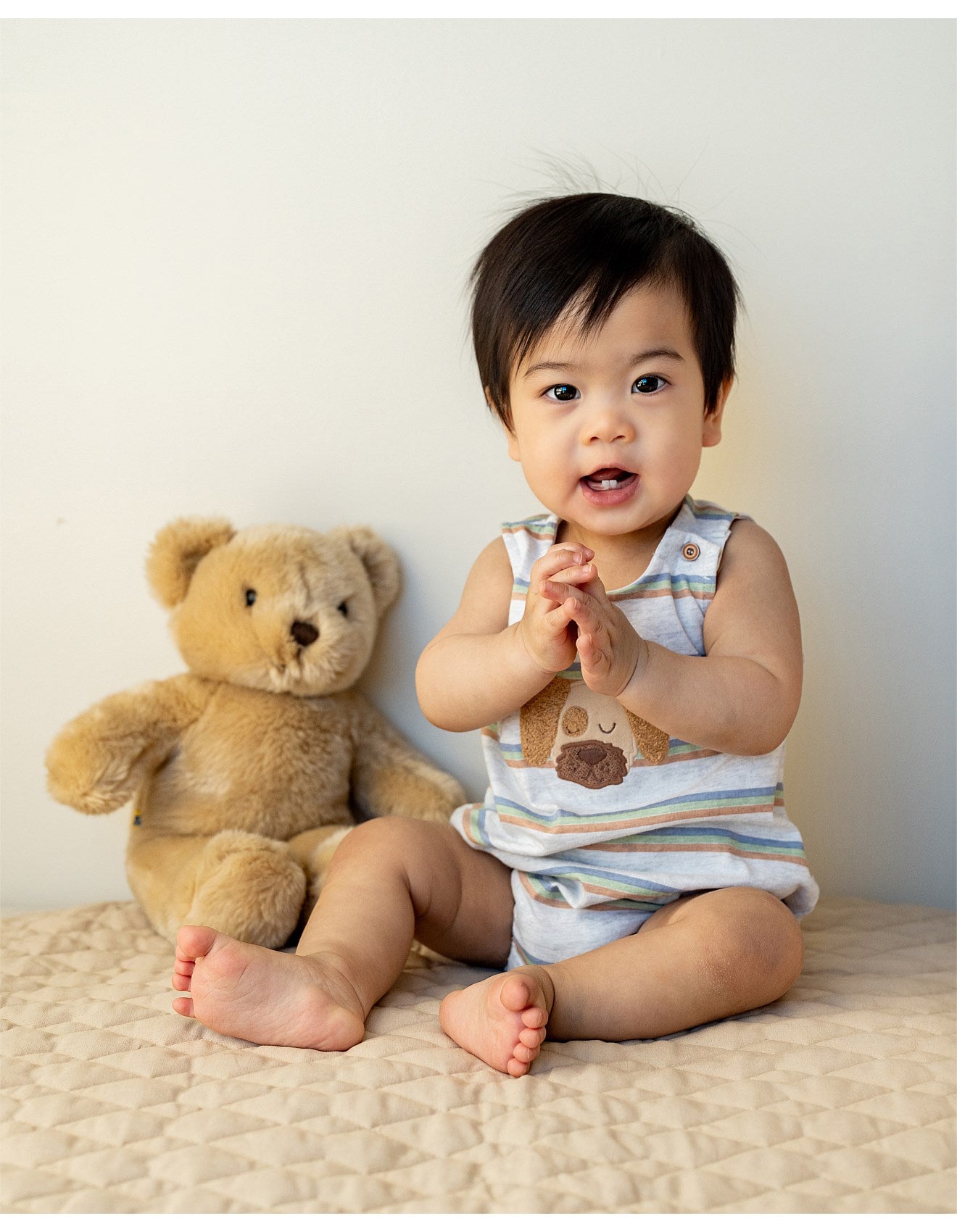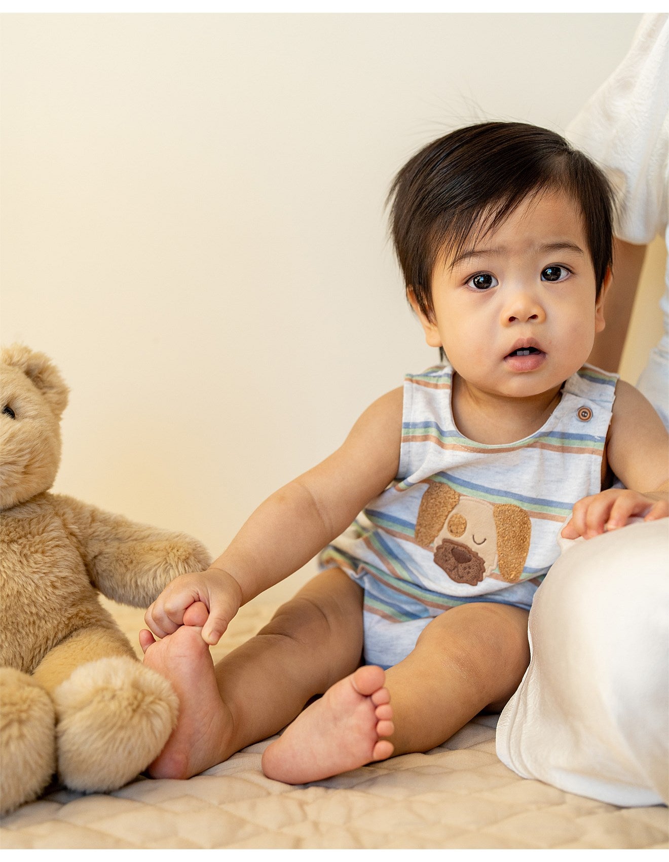 A playful pup for sunny day adventures. This striped romper is soft, sweet and full of fun, with an adorable tufted dog embroidery and soft pastel hues. Perfect for playtime or outings with mum and dad, it's designed for comfort and ease with simple fastenings and a relaxed fit.