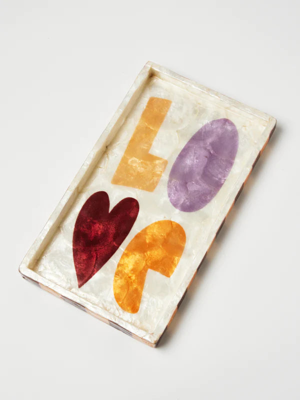 The word "LOVE" is beautifully incorporated into this design, reminding us of the power of love in our lives. With its bold and expressive typography, it serves as a daily affirmation that resonates with everyone who encounters it and brings a smile to your face every time you pass this capiz tray in your home. Playful stripes follow the edge of the tray and frame the design.