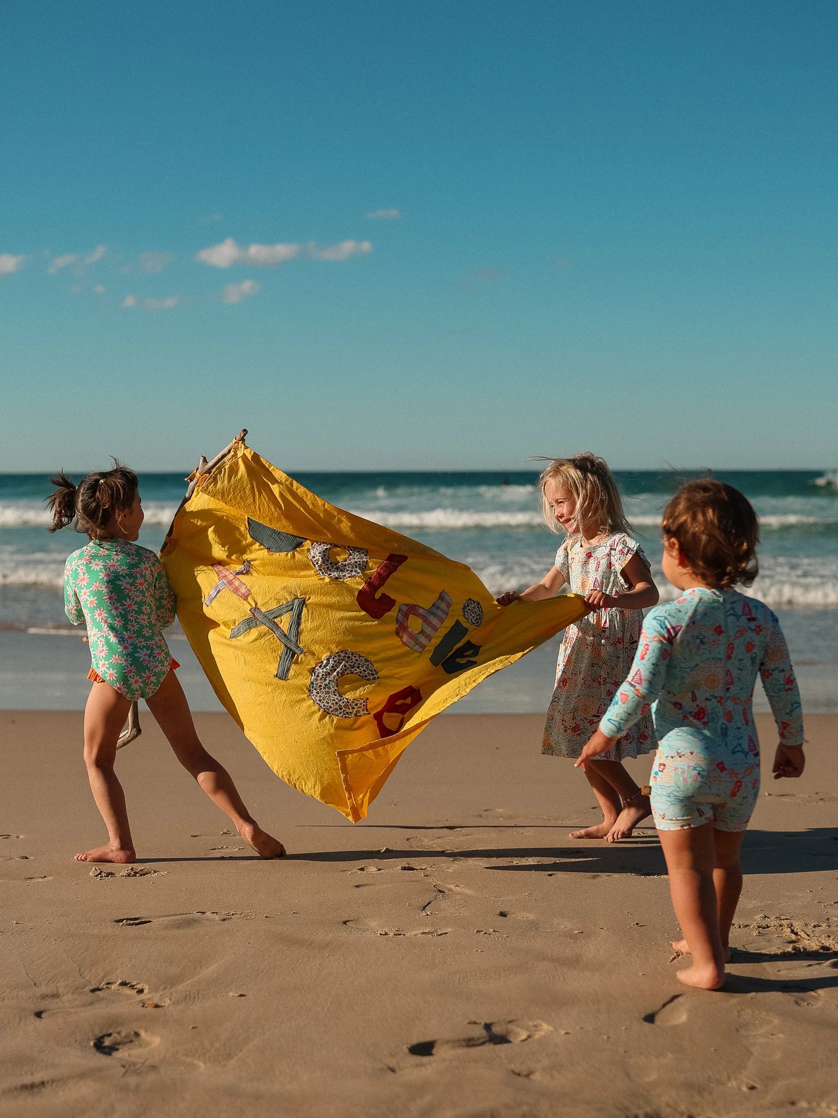 Turquoise, daisies, and a pop of orange frill – long sleeves to keep the sun off while they pretend to be mermaids (or just splash everywhere).