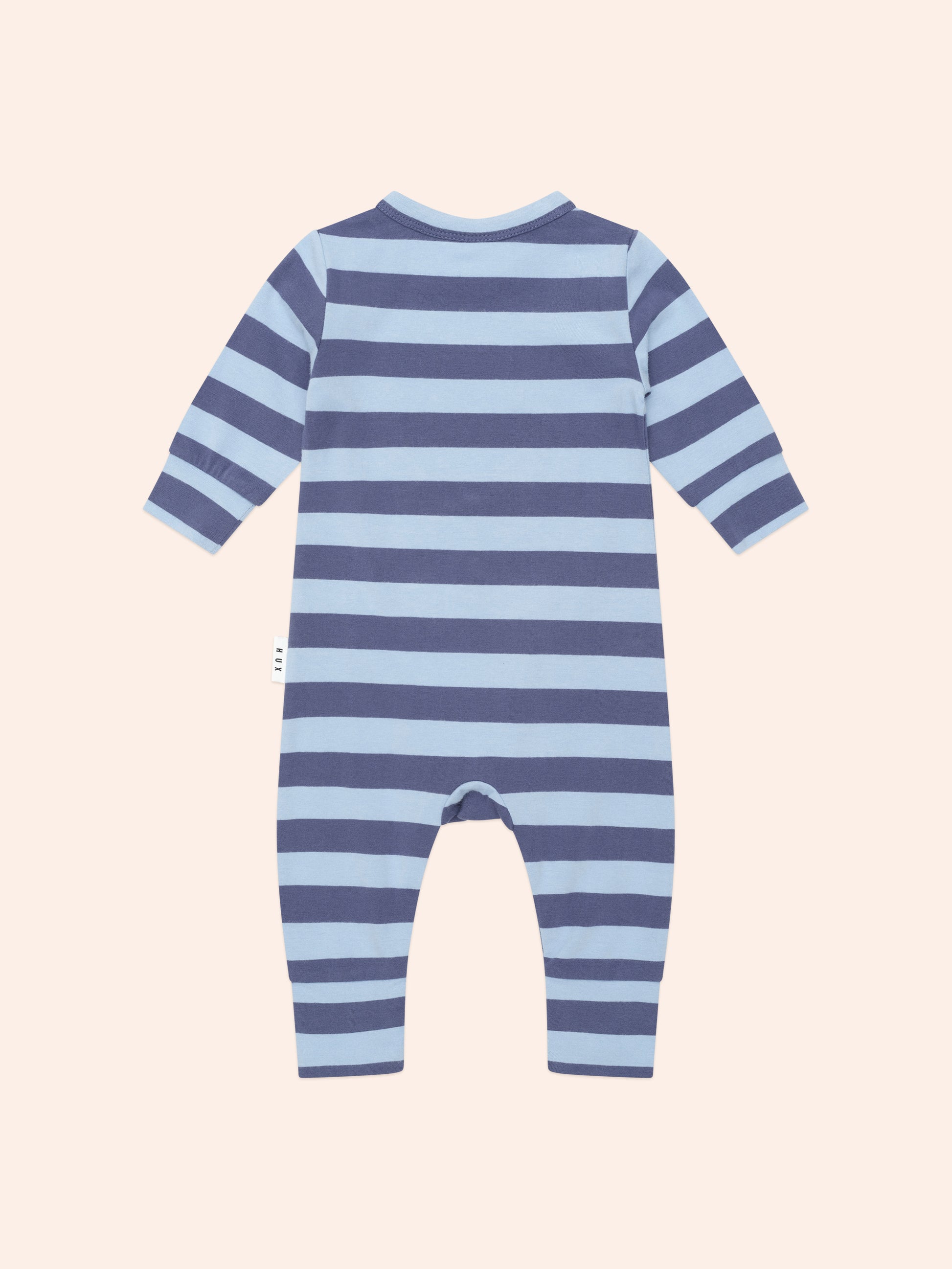 A marshmallow-soft striped romper with fun and furry Huxbear embroidery. Consciously crafted from premium organic cotton, it has stainless steel snaps at the shoulder and crotch for super snappy dressing. Just add squishy legs.