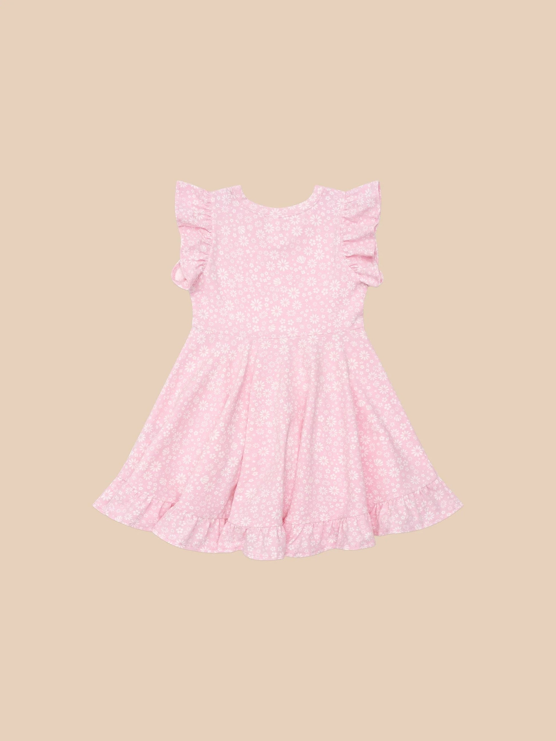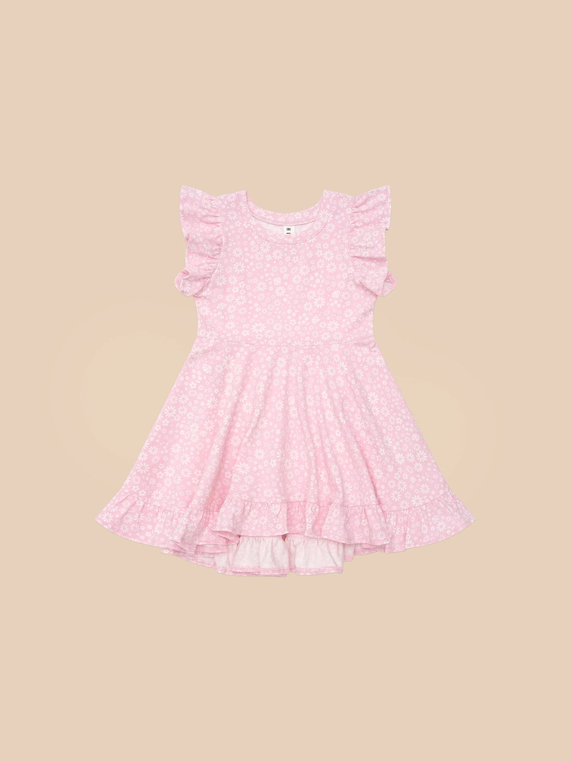 - super soft, premium organic cotton jersey swing dress with all over daisy seashell print and frill sleeves