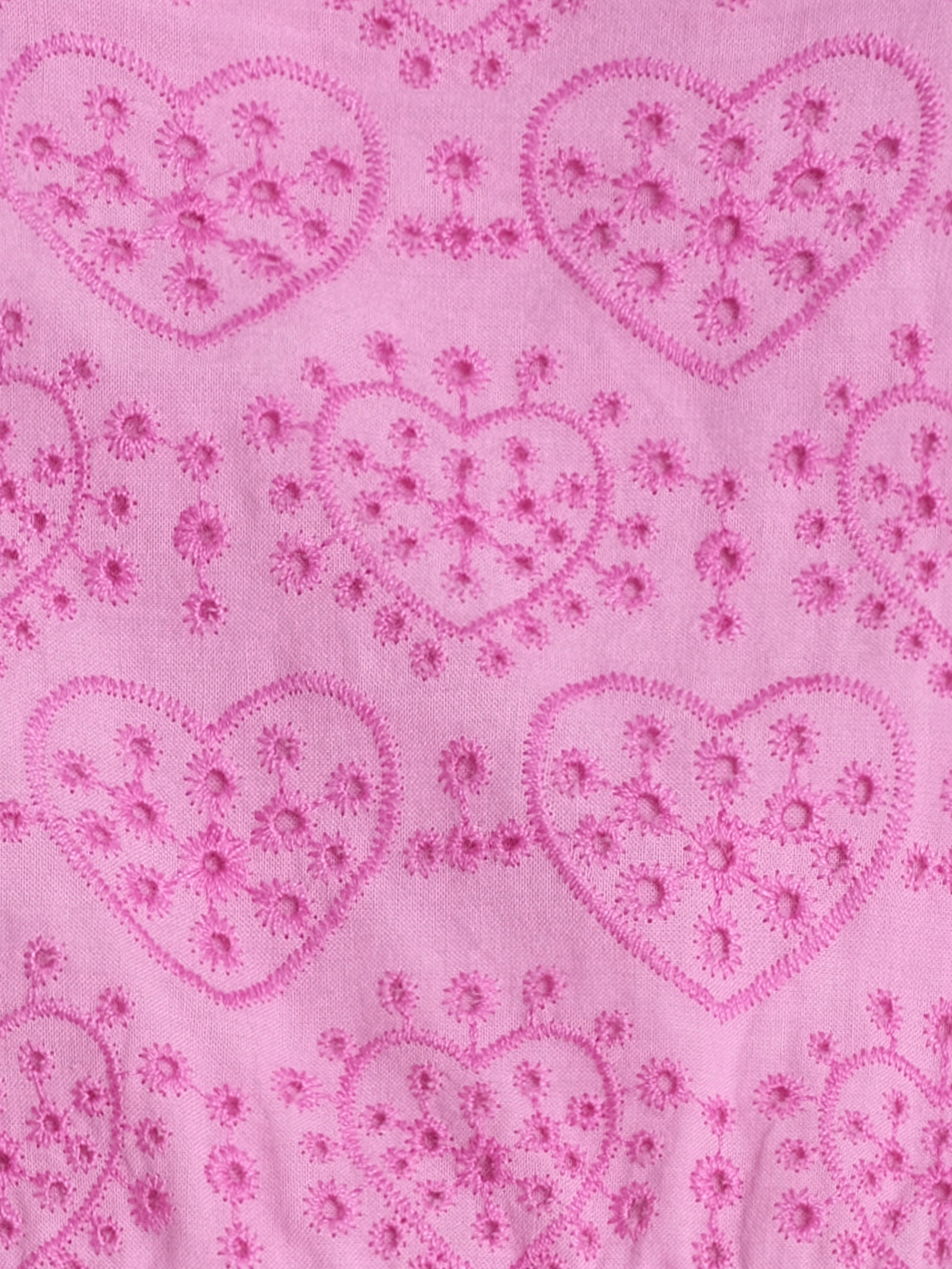 A frilly broderie anglaise dress made from soft magenta cotton. Features playful shoulder frills, front pockets and adjustable straps. Style it alone or over a long sleeve top and cardi for cooler days.