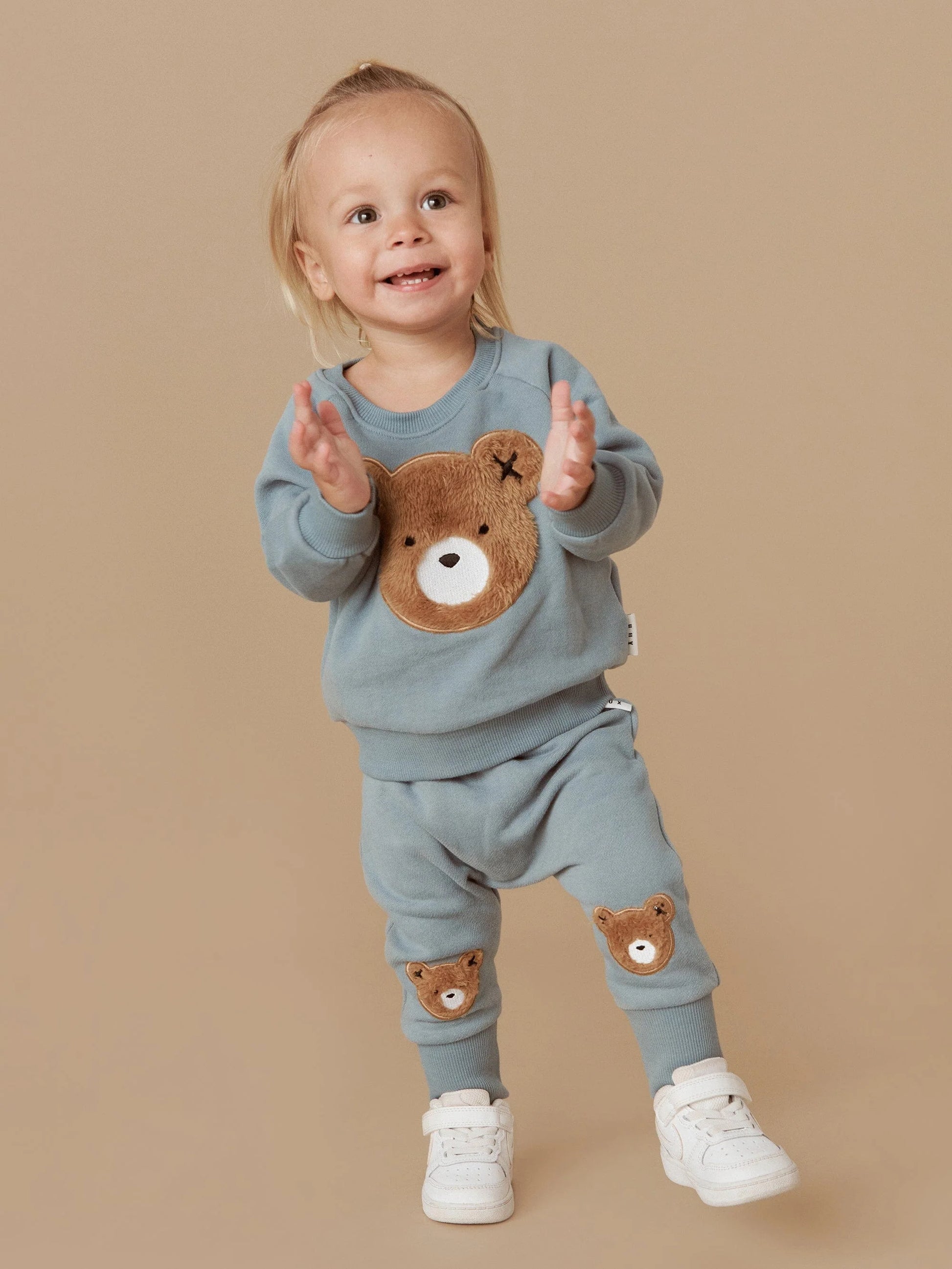 - Super soft, premium organic cotton fleece drop crotch pant with furry huxbear applique on knees