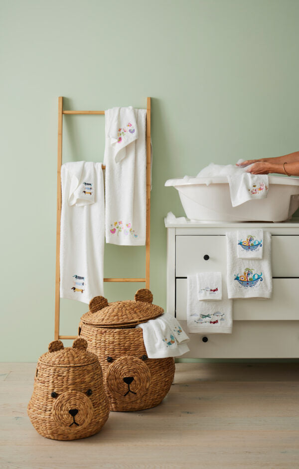 Use this Flying High baby bath towel and face washer set in the nursery for bub’s first bath and beyond! The super soft absorbent cotton towelling is gentle on the skin and features an intricately embroidered lion and elephant.