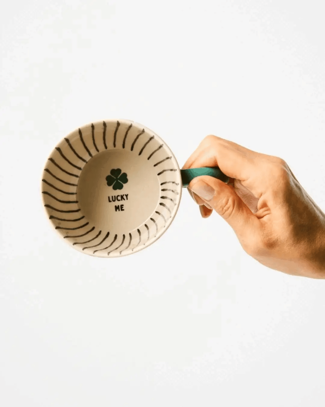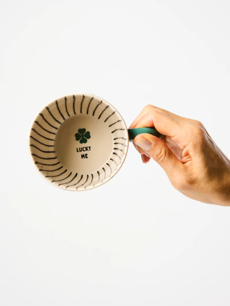 Green four leaf clover's encircle this mug, leading to an interior of thin black stripes and a tiny four-leaf clover and "Lucky Me" inscription on the base, that transforms each sip into a moment of gratitude. Designed in our Sydney studio and hand-finished in Vietnam, its emerald handle adds a flash of colour to your morning coffee ritual or afternoon tea pause.
