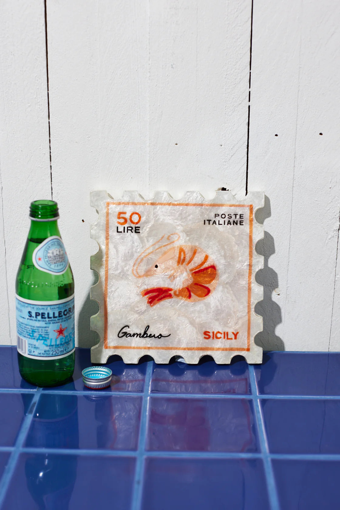 Bring vintage Italian charm home with the super cute Gambero Stamp wall tile. Handcrafted from luminous capiz shells, it boasts an iridescent shimmery finish. The tile is a classic postage stamp design with an intricate perforated edge pattern featuring a striking prawn image. Rich pink shades, decorative flourishes, and calligraphic text evoke old-world Italian elegance. Perfect for accent walls or niche walls, this artisan tile adds Mediterranean flair with its natural materials and hand-painted designs inspired by the sunny warmth of Italy.