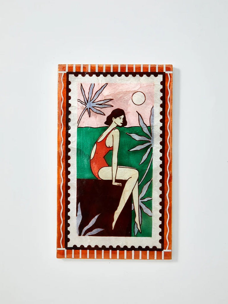 Introducing our captivating Resort Wall Art series, where swimsuit clad women bask in the shimmering ambiance of a glamorous hotel resort pool. Each piece is hand-painted on authentic capiz shell from the Philippines, making every artwork a unique piece. With these alluring designs, you can bring the essence of luxurious leisure to your home. Dive into a world of sophistication and relaxation as you adorn your walls with these, one-of-a-kind creations.