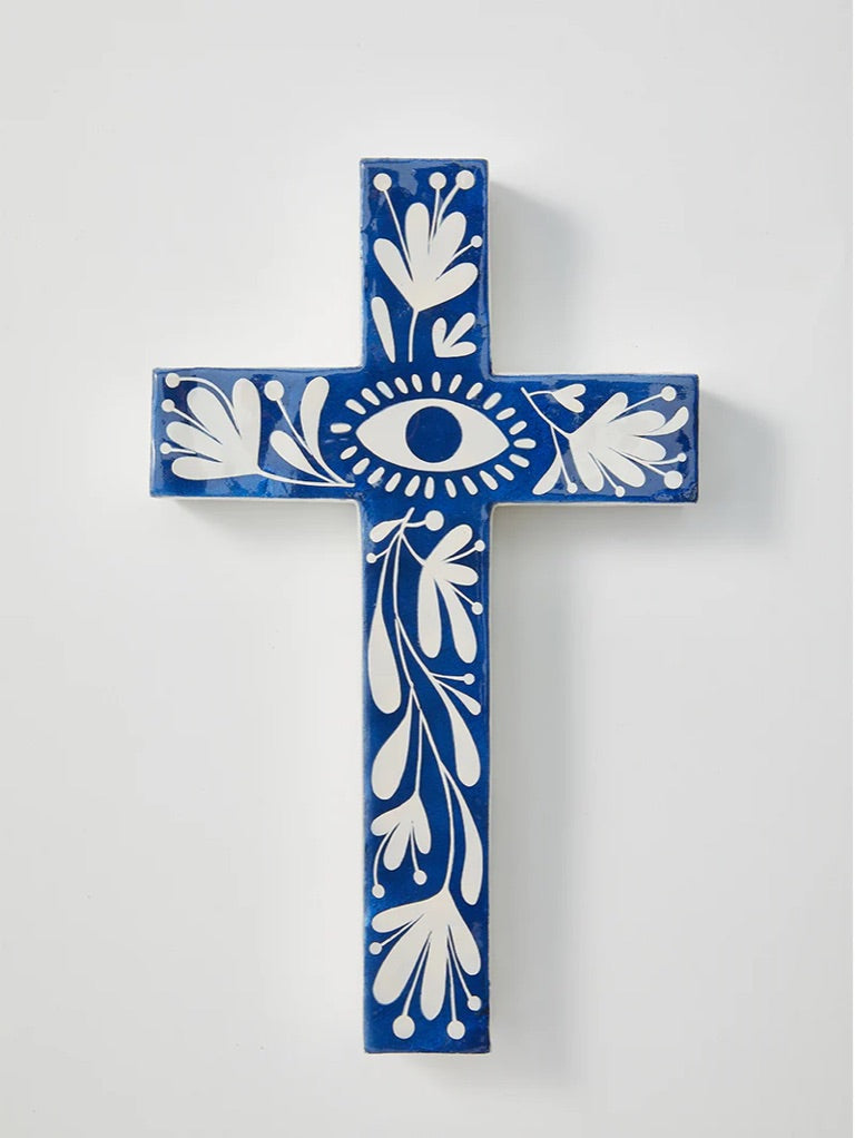 Detailed designs on this cross collection intertwine symbols like the Evil Eye, palm trees, hearts, birds, and flowers. These unique crosses are hand-drawn and painted on natural capiz shell from the Philippines, infusing your space with the vibrant spirit of Tulum. Create an original vignette on the walls of your home with these unique, symbol-rich capiz shell crosses, reminiscent of the exotic spirit of Mexico.