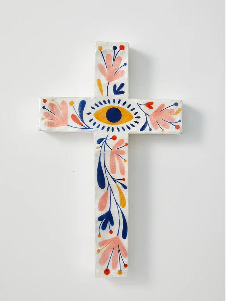 Detailed designs on this cross collection intertwine symbols like the Evil Eye, palm trees, hearts, birds, and flowers. These unique crosses are hand-drawn and painted on natural capiz shell from the Philippines, infusing your space with the vibrant spirit of Tulum. Create an original vignette on the walls of your home with these unique, symbol-rich capiz shell crosses, reminiscent of the exotic spirit of Mexico.