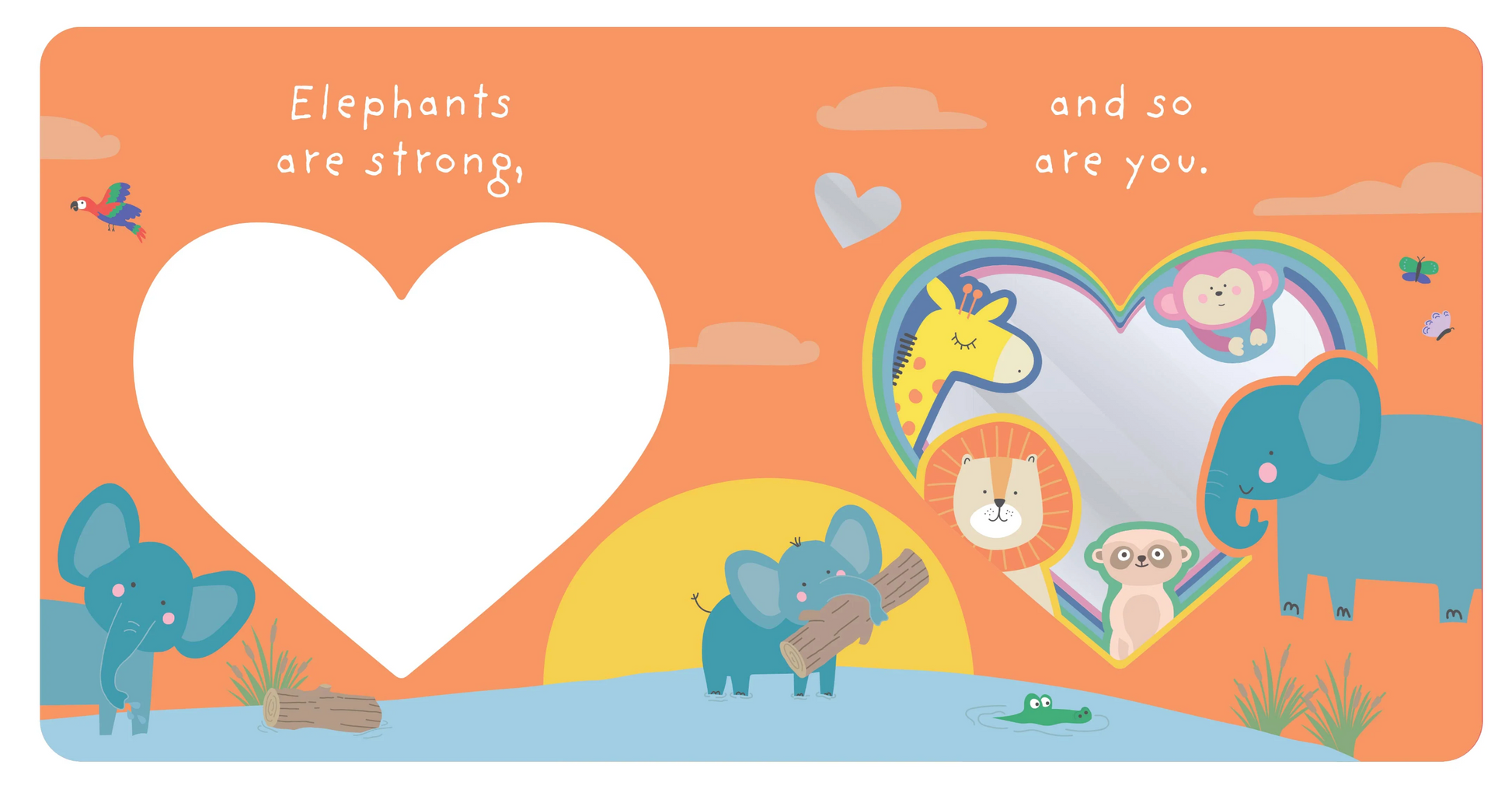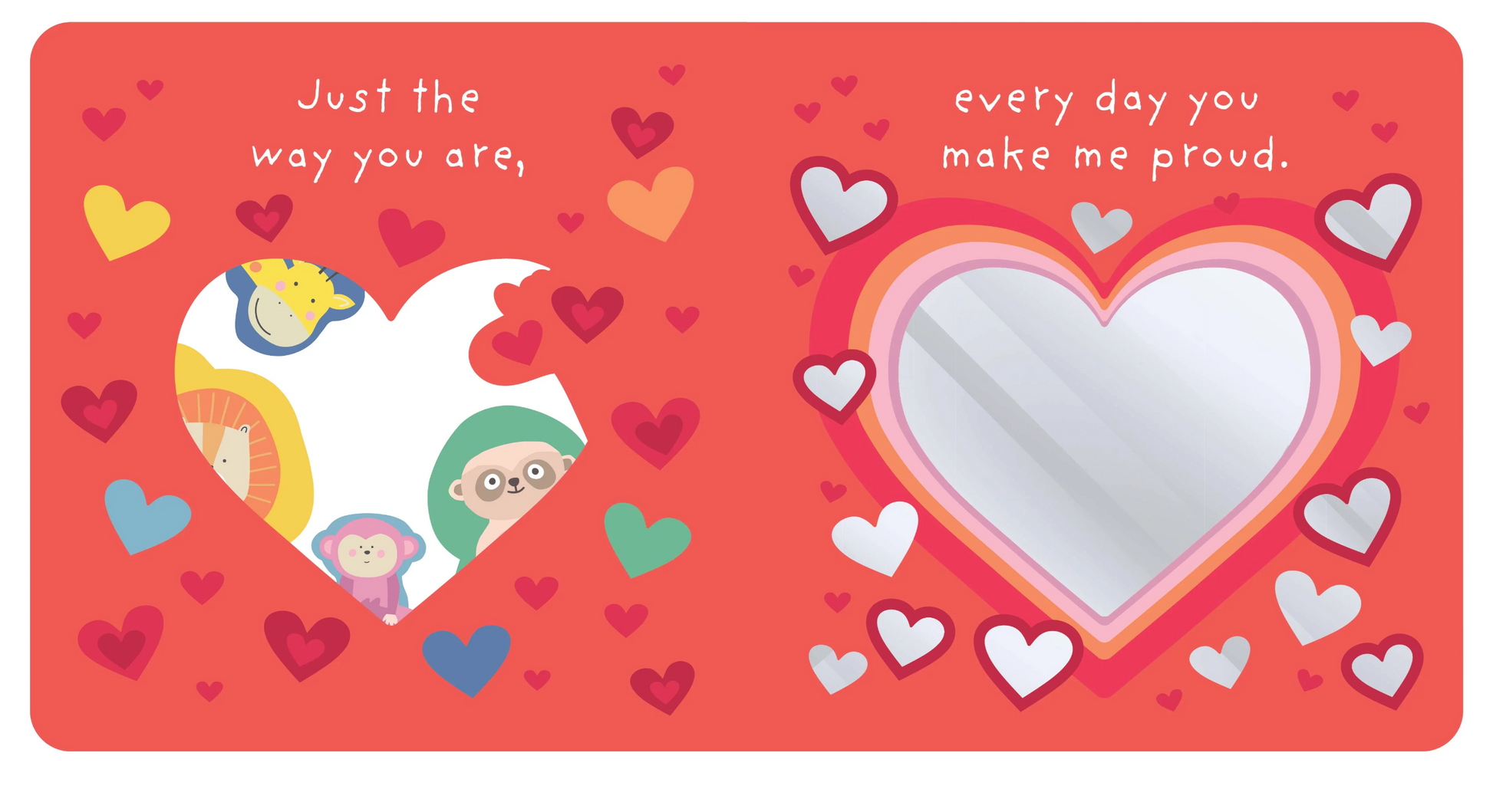 This sweet board book is designed to be enjoyed during cosy reading time between little ones and their caregivers and celebrates the beautiful message that children are loved just the way they are. Little ones will be captivated by sweet illustrations of animal friends playing with their families. Simple rhyming text will engage young readers time and time again. Graduating die-cuts lead to a mirror on the final spread that reveal the little reader’s own adorable face, inviting them to become part of the story.