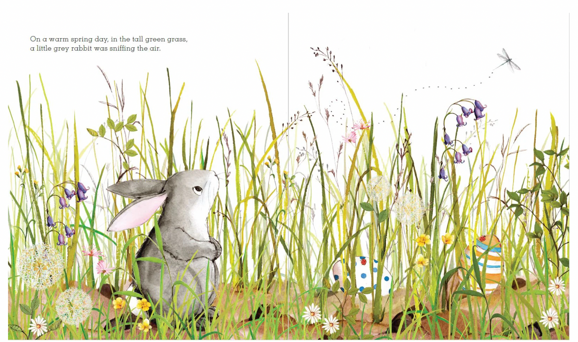 On a warm spring day, in the tall green grass, a little grey rabbit was sniffing the air.