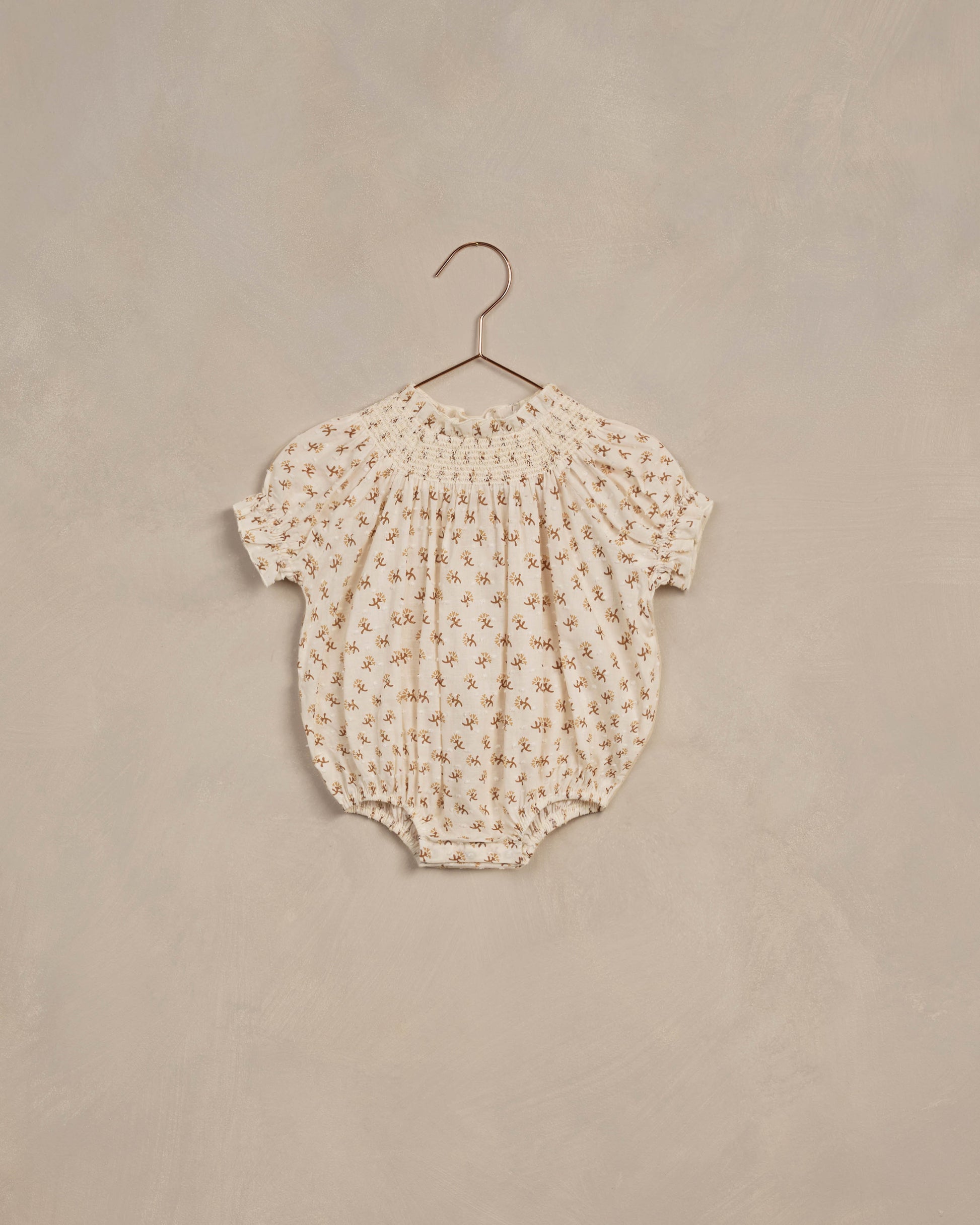 A unique smocked neckline adorns this vintage inspired romper designed to perfectly match our Maddie dress. It has vintage swiss dot textured fabric and button back closure.