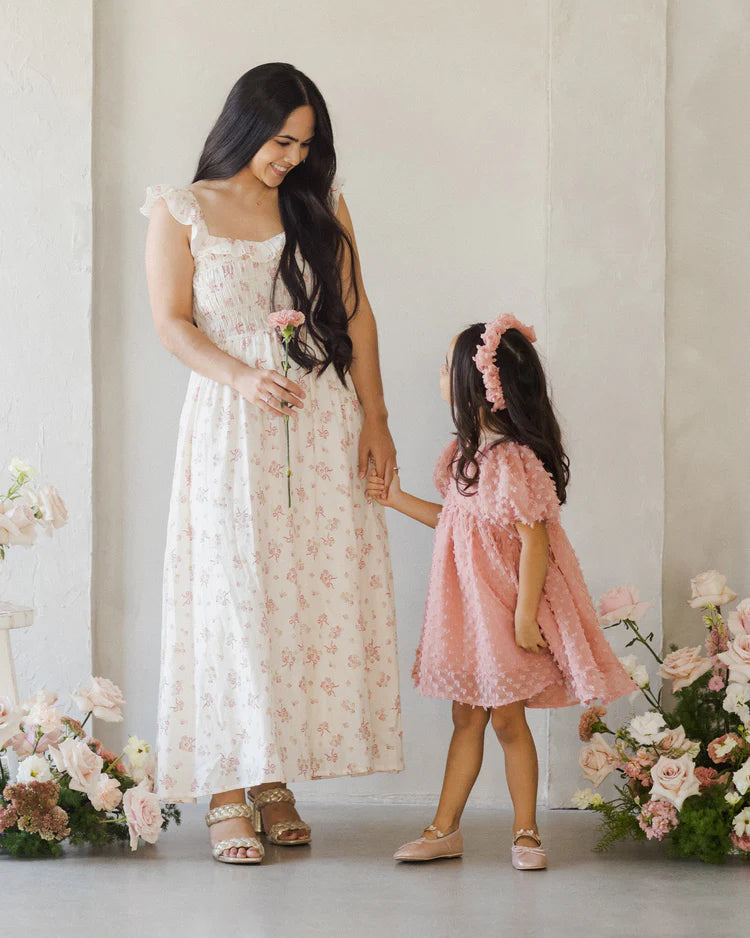 The Luna Dress features a babydoll inspired silhouette with pretty puff sleeves and a curved waistline in our fun popcorn woven fabric.