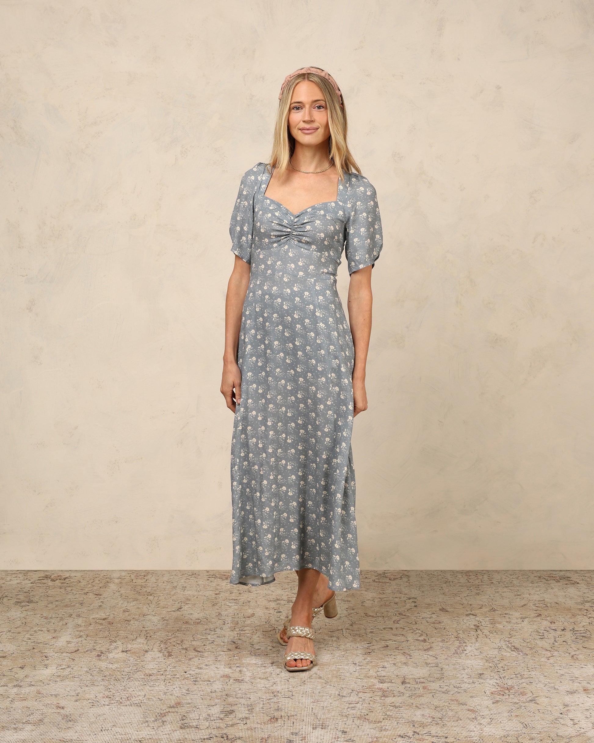 Our Voilet Dress has above elbow sleeves, and a gathering at the front bodice. Perfect for your special occasions.