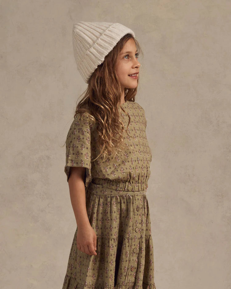Featuring our 'flower block' all-over pattern on fern. The olive tones and rust details of Flower Block gives all the throwback vibes for modern little girls.