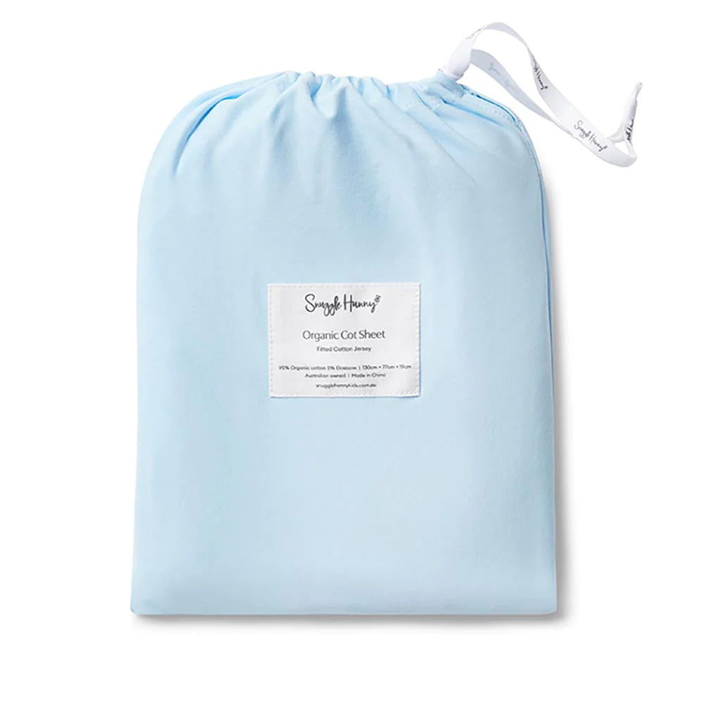 Snuggle Hunny Baby Blue Fitted Cot Sheet is made from snuggly soft organic stretch cotton jersey. It is stretchy so fits most cot mattress sizes and comes in a matching drawstring bag.