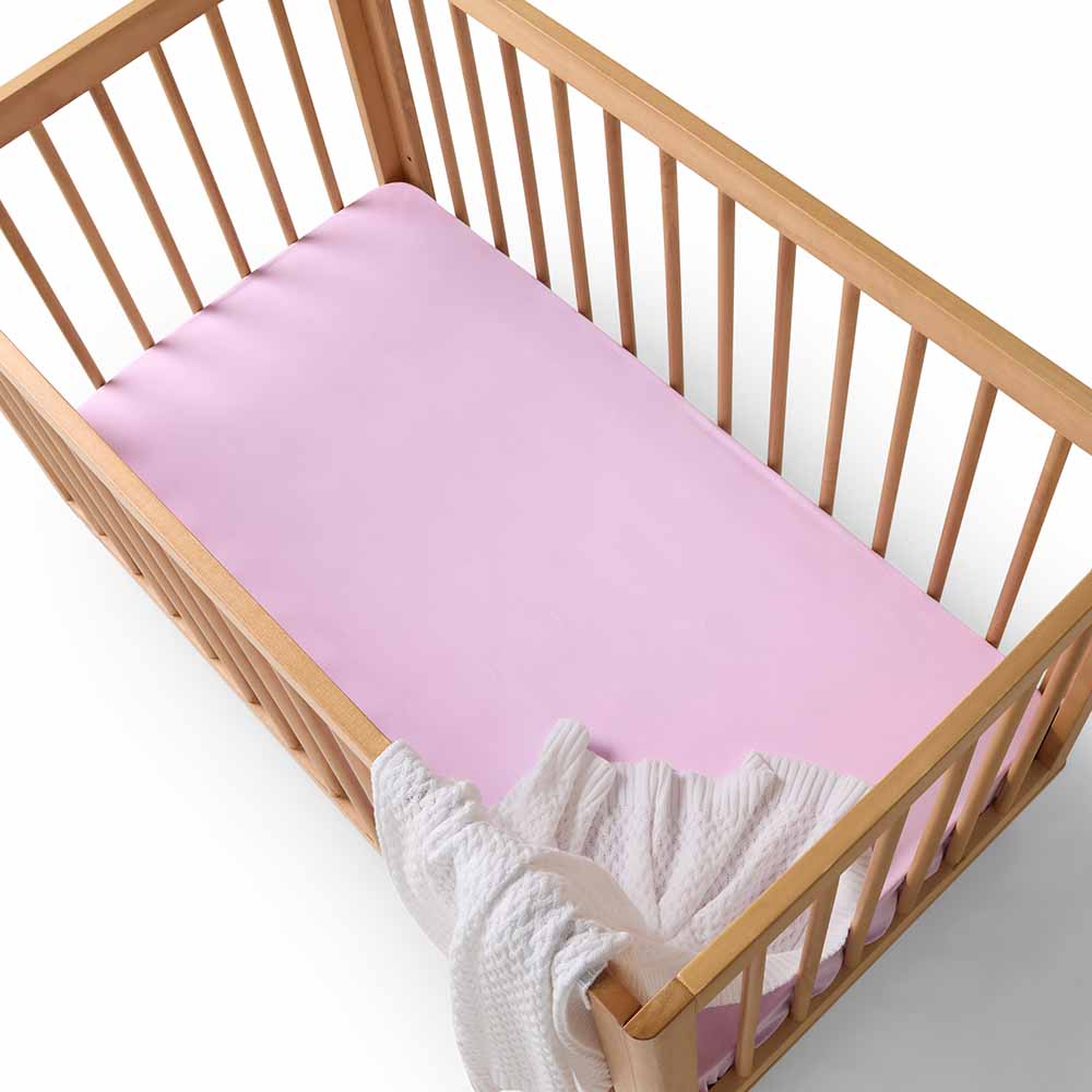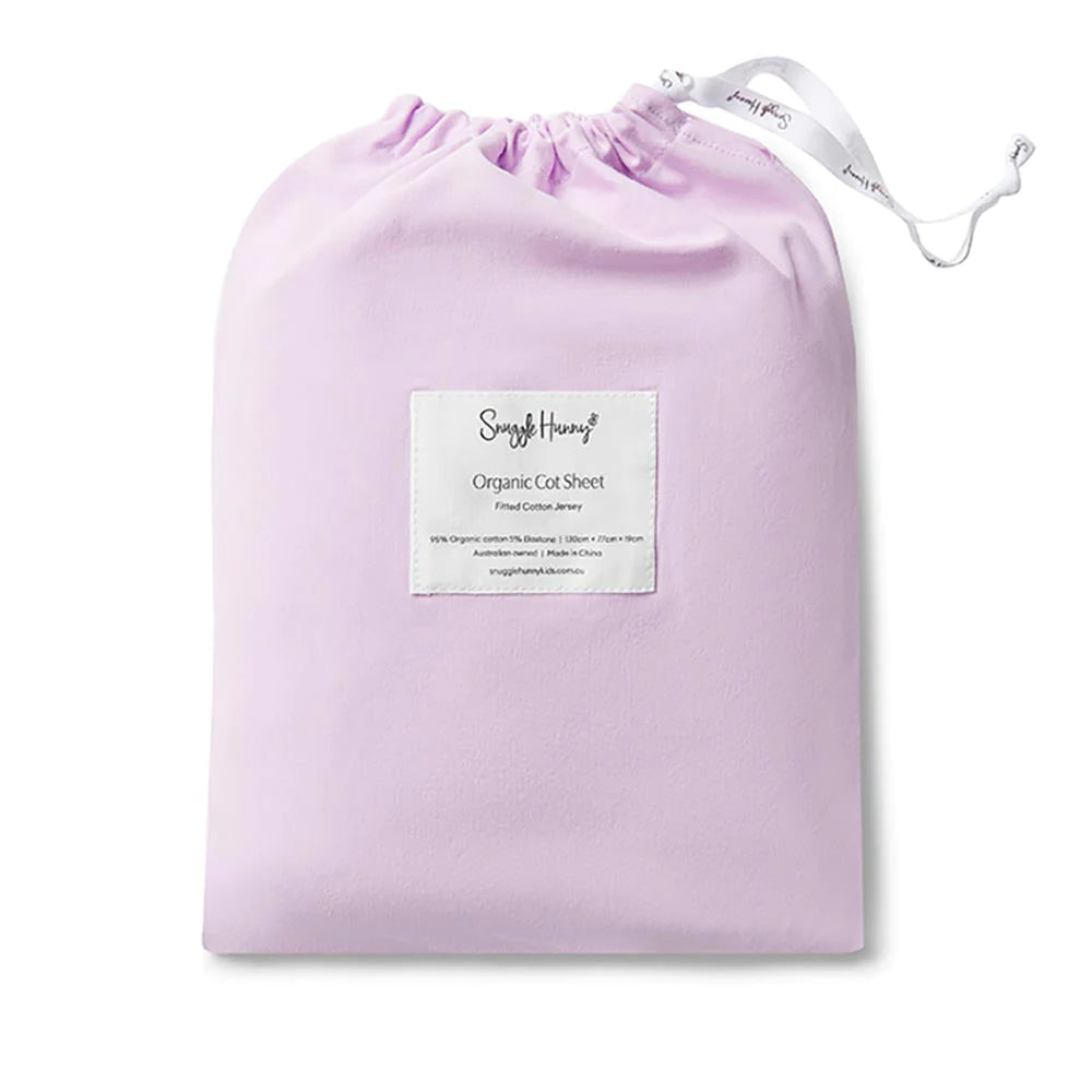 Snuggle Hunny Lilac Fitted Cot Sheet is made from snuggly soft organic stretch cotton jersey. It is stretchy so fits most cot mattress sizes and comes in a matching drawstring bag.