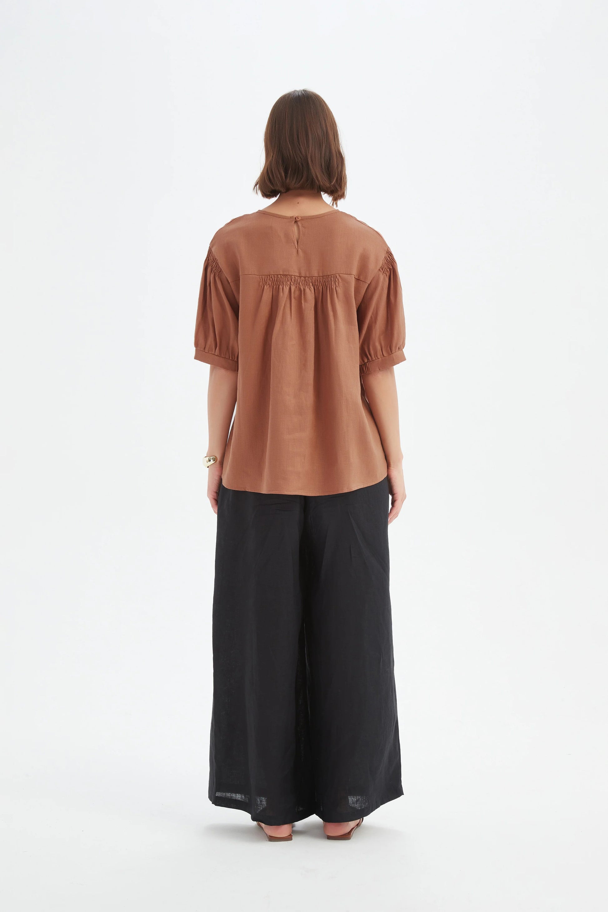 Discover effortless elegance with the Bishop Sleeve Shirring Top. Crafted from 100% French Linen, this top features intricate shirring details on the back and sleeves, creating a beautifully textured look. The gathered front and billowy bishop sleeves enhance its refined charm, making it a versatile addition to your collection.