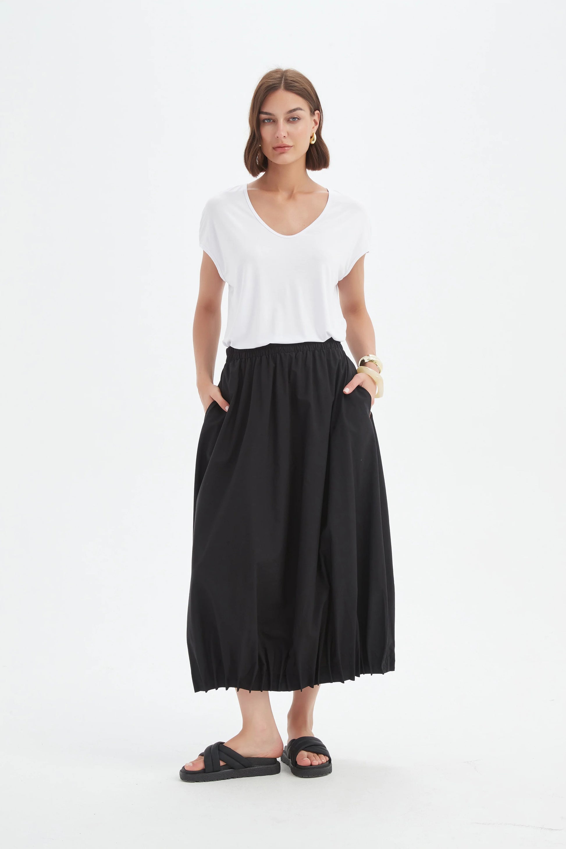 The Pin Tuck Hem Skirt is a versatile midi crafted from a lightweight cotton/lyocell blend. Its elasticated waistband and side pockets combine comfort with practicality, while the delicate pin tuck hem adds an air of elegance while shaping the silhouette. Designed to move effortlessly with every step, it pairs beautifully with tees and shirts for an elevated everyday look