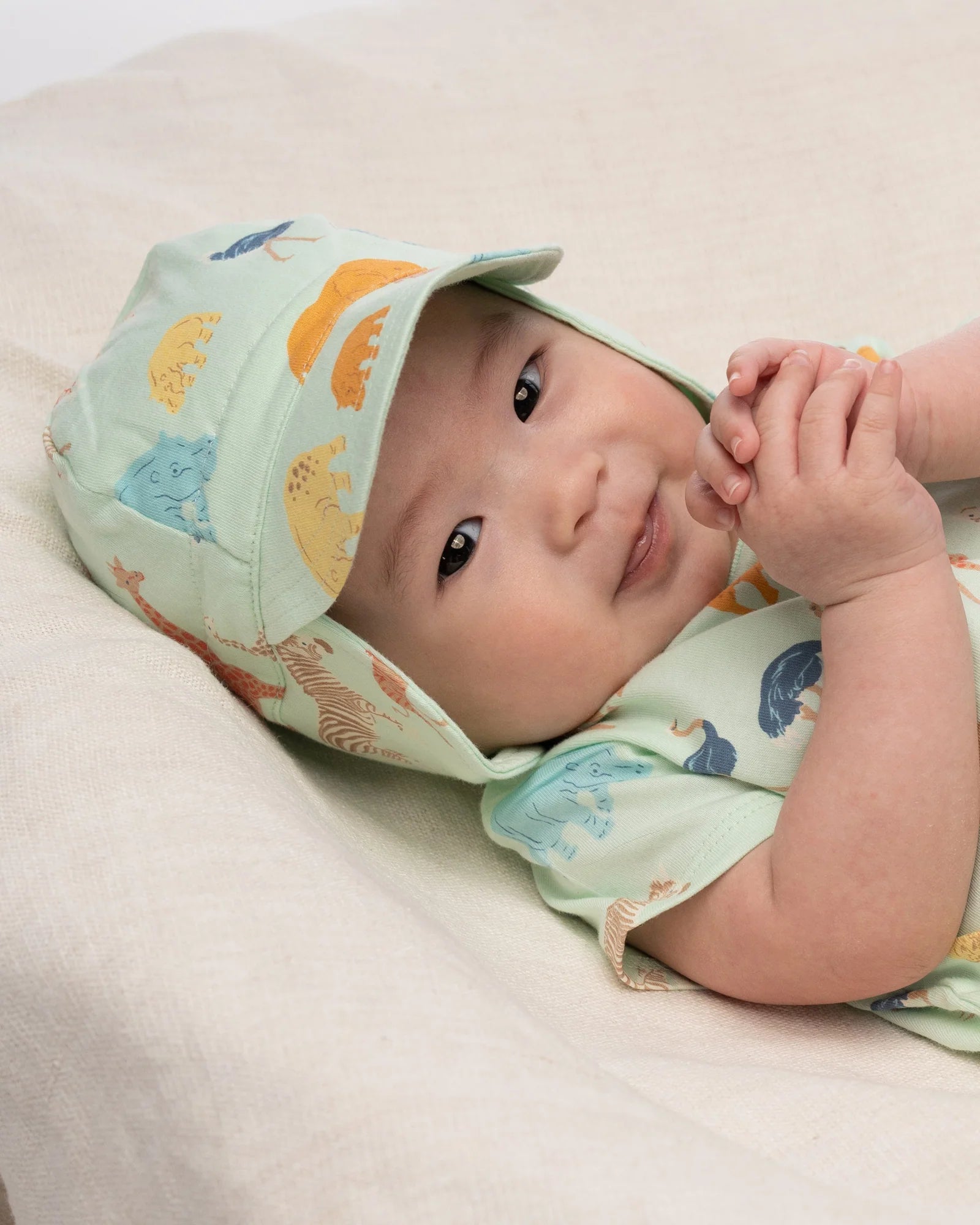 Flap Cap Down Under is an iconic Toshi baby sunhat. The UPF 50+ UV rating indicates maximum sun protection. Shielding precious babies from the elements is the primary focus in the creation of this sunhat. The Toshi Flap Cap has a contoured neck flap for enhanced sun protection. A head tie with soft cotton toggle creates adjustable sizing. The chin tie with soft cotton toggle secures the hat and offers ease of wear. The security release clasp on the chin tie is designed to enhance wearer safety. The cap is fully lined for increased comfort. Made from the finest quality cotton knit, the baby sunhat is gentle to wear, functional and practical. An original and exclusive Toshi print design is featured.