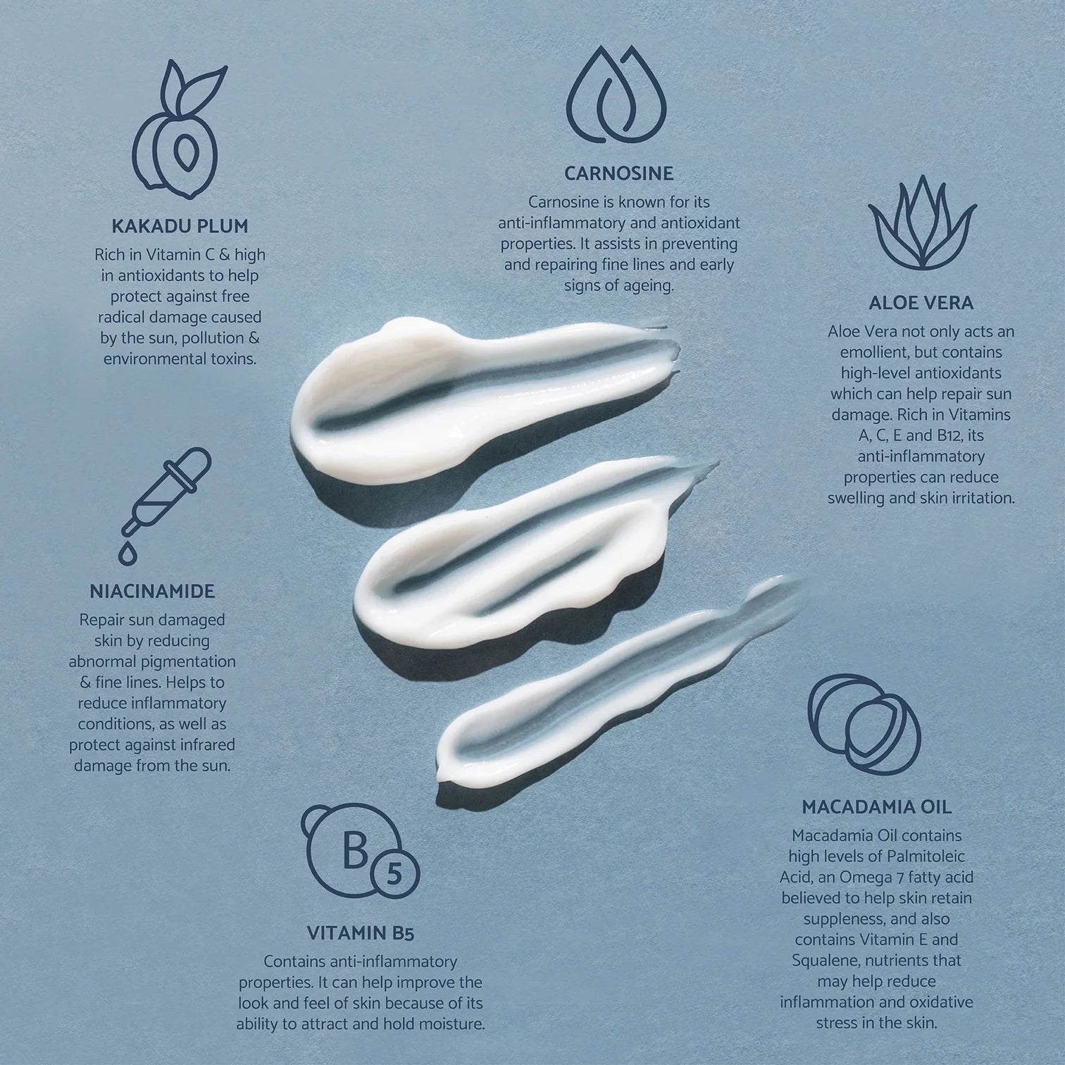 Rest easy knowing we clock on as you clock off and get to work protecting, restoring and hydrating your skin for a brighter tomorrow. Enriched with 7% Niacinamide (Vitamin B3), Kakadu Plum Extract (Vitamin C), Vitamin B5, Carnosine, Macadamia Oil & Aloe Vera to help balance & brighten skin tone, reduce the appearance of pigmentation and fight the visible signs of aging.