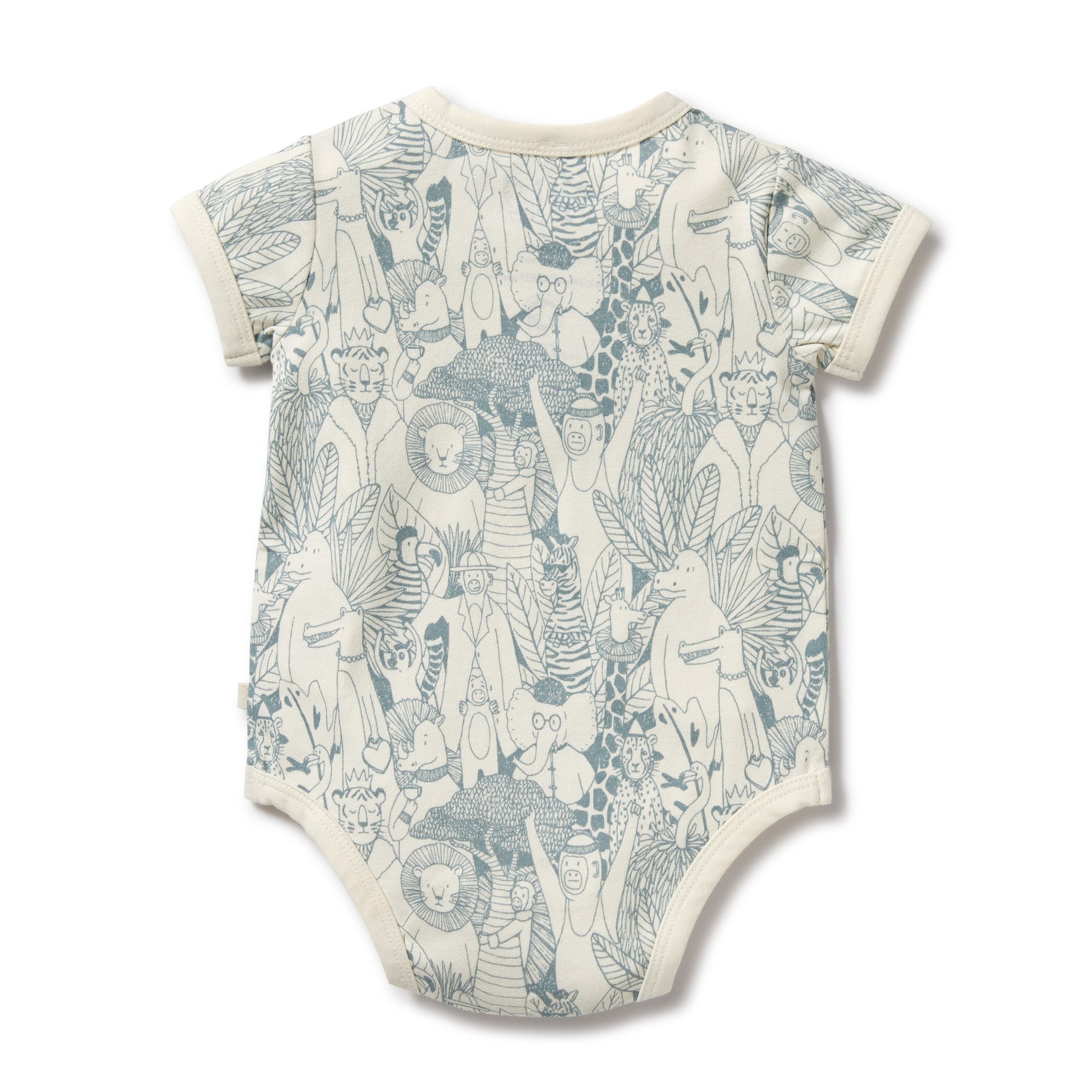 Key Features: Short Sleeved. Side neck opening with mock wood buttons. Snap leg closure for easy changes. Made with GOTS certified organic cotton. Australian owned and designed. Packaged in a bio-degradable bag.