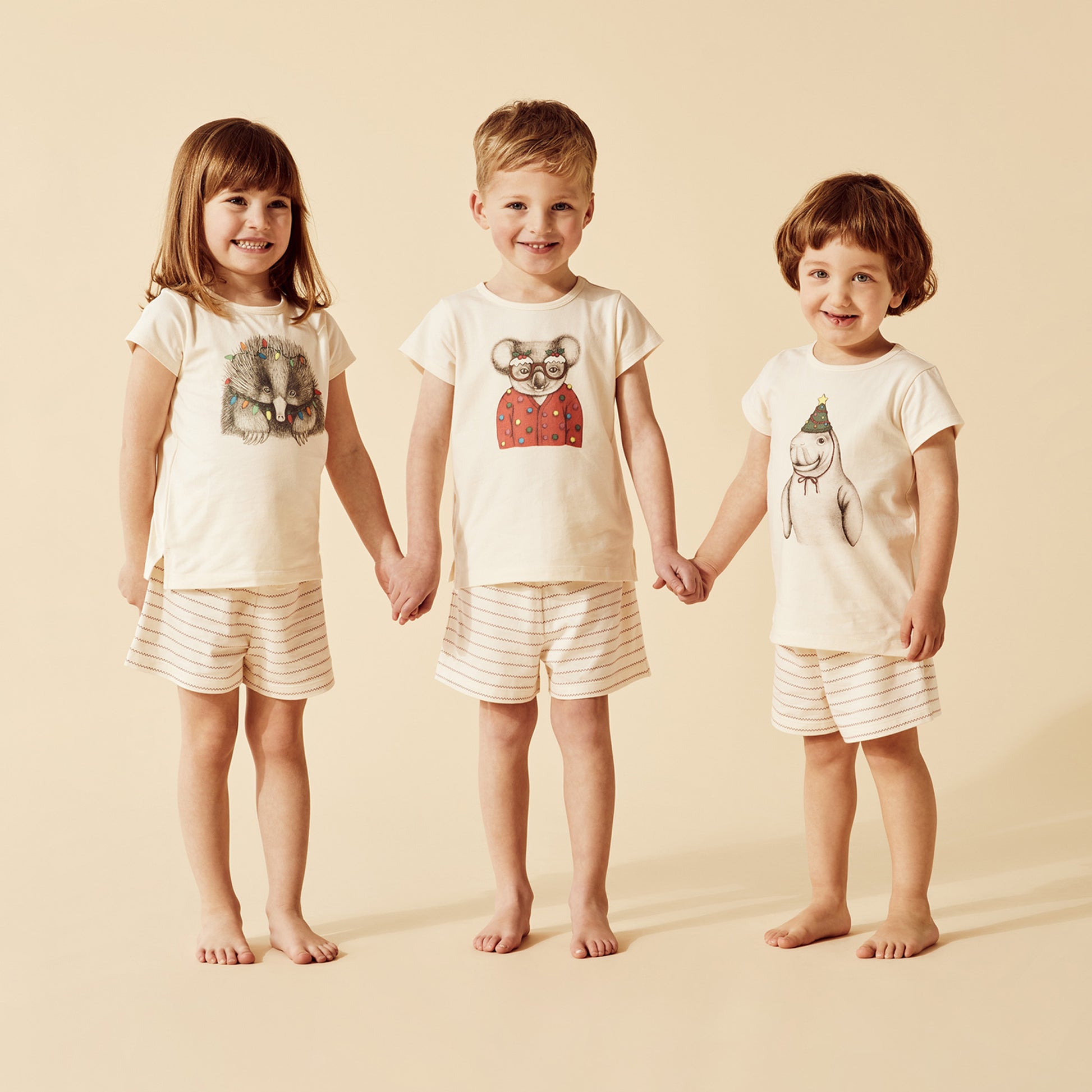 Make Christmas special with these Koala Organic Christmas Pyjamas. Made from GOTS certified organic cotton, these PJ's are super soft and cuddly. Perfect for every family photo-op you got planned. Get ready to enjoy the festive season dressed up in absolute style and comfort. This set comes with a fitted short sleeved tee and mid-length loose fitted short. Key Features: Soft waistband is gentle on little tummiesAvailable in kids sizes 1-7Snug fit for child & baby's safetyMade from GOTS certified organic cottonWrapped in a compostable bagLOW FIRE DANGER Complies to the AS,NZS 1249-2014 sleepwear standards. CAUTION - KEEP AWAY FROM HEAT AND FLAMEDetails95% organic cotton, 5% elastaneCertified by: Ecocert, EGL 212333 Machine washable. Made in India.